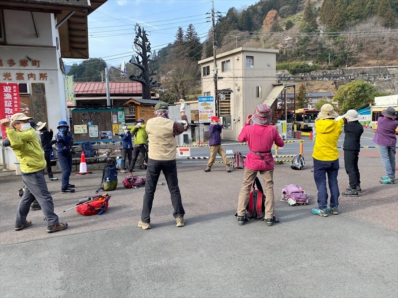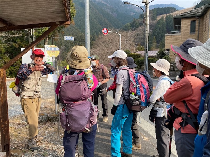奥多摩病院前のバス停でのリーダー解散挨拶。解散後も、揃って、奥多摩駅まで歩きました。