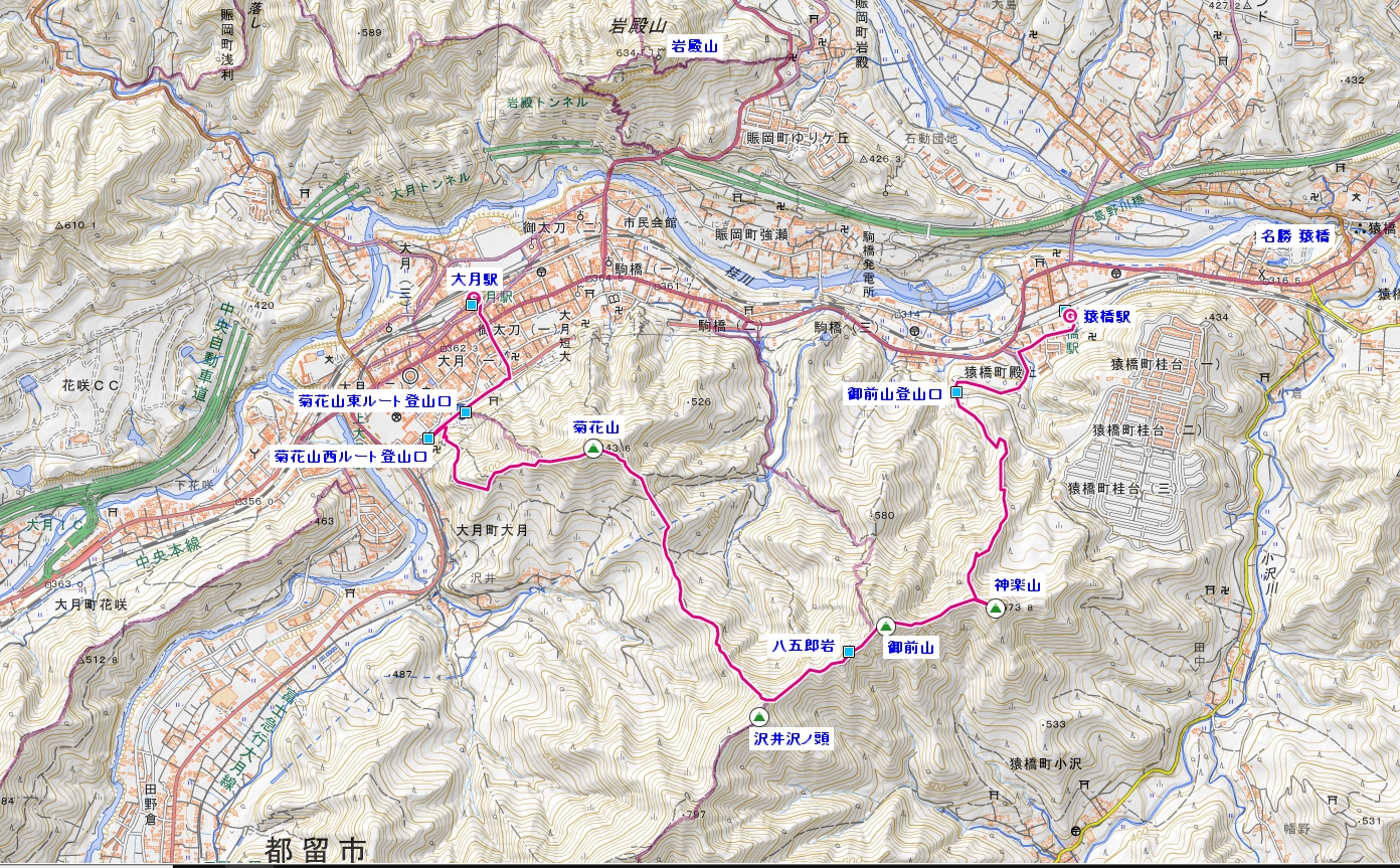 | 「ルート&タイム」 大月駅スタート 9:44 → 菊花山西ルート登山口 9:57 → 菊花山 10:58 → (途中、昼食30分) → 沢井沢ノ頭分岐 12:34 → 八五郎岩 12:48 →御前山 13:01 → 神楽山 13:32 → 御前山登山口 14:31→ 猿橋駅ゴール 14:41 。 距離:5.96km 、所要時間:5時間57分。(GPSデータ参照) |