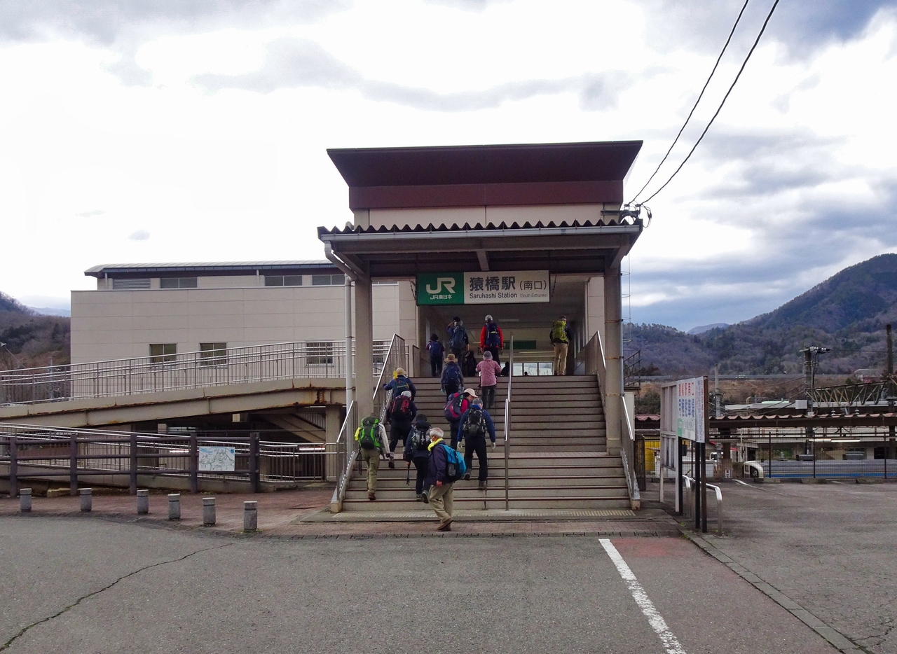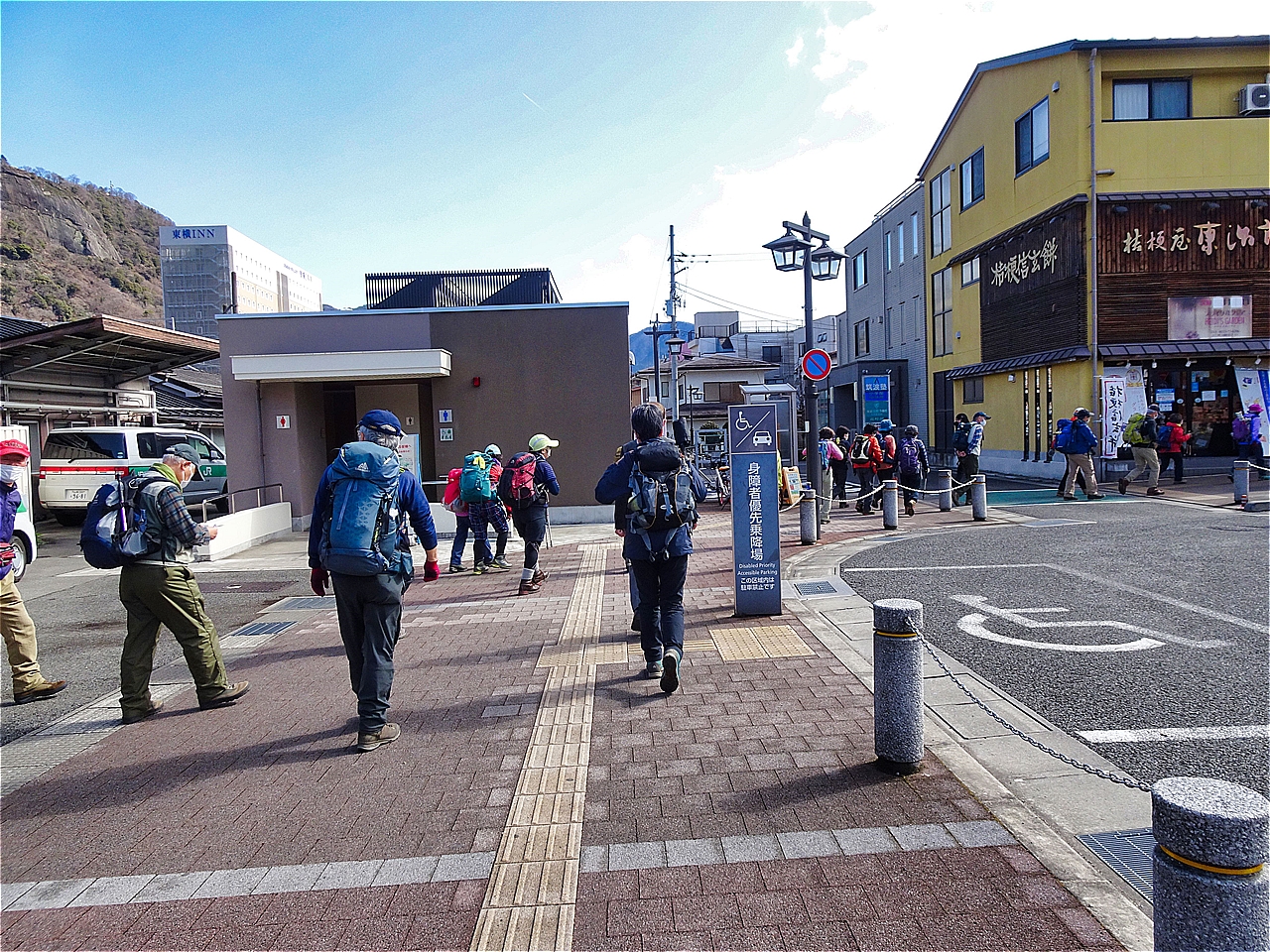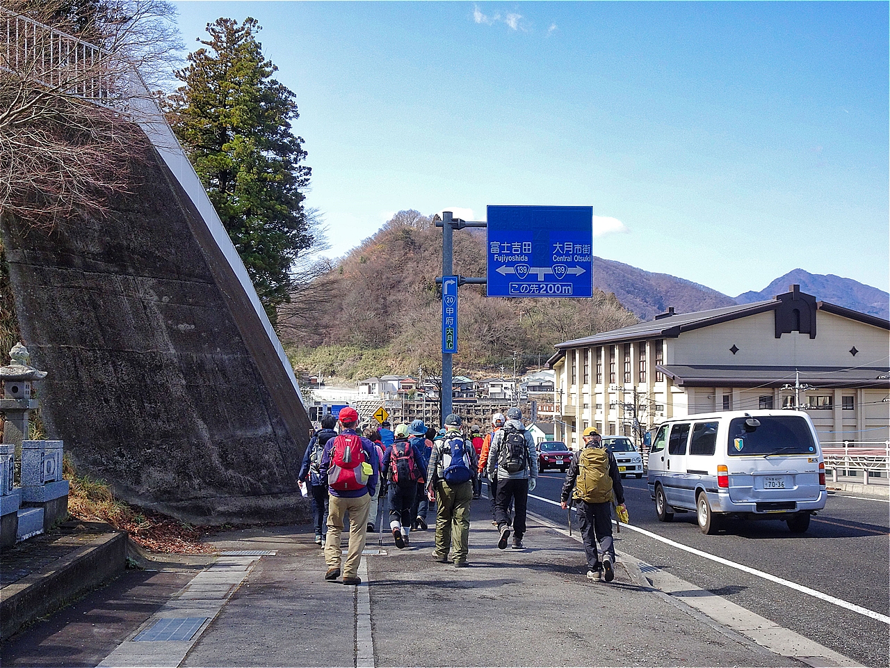 | 大月駅前スタート | 国道20号沿いを進む | リーダー挨拶 |