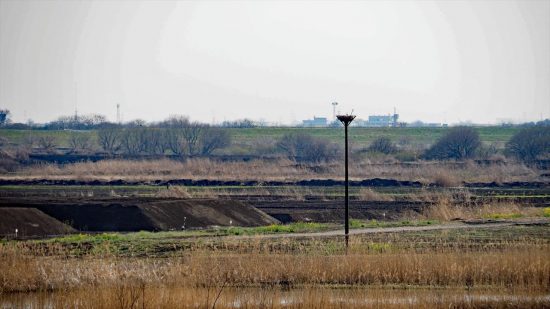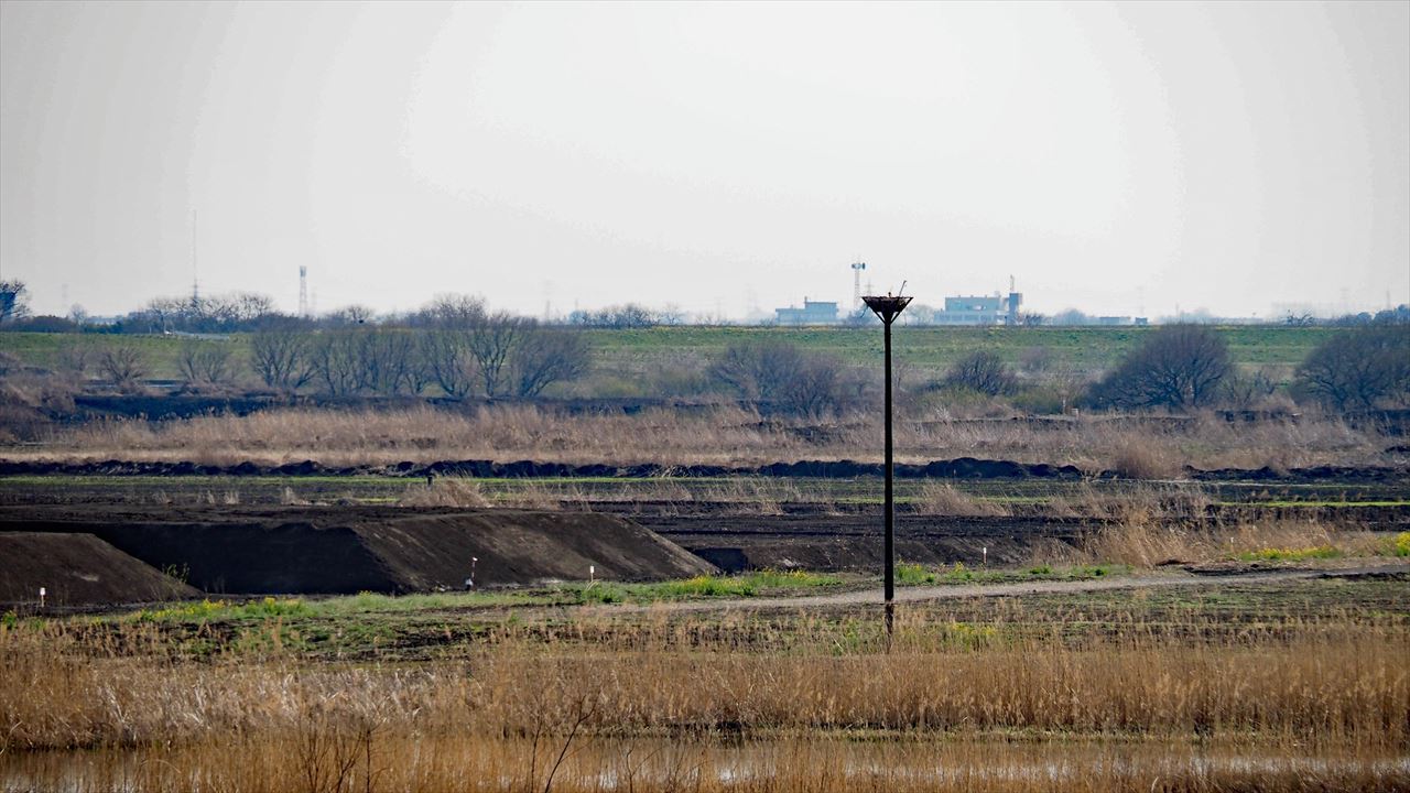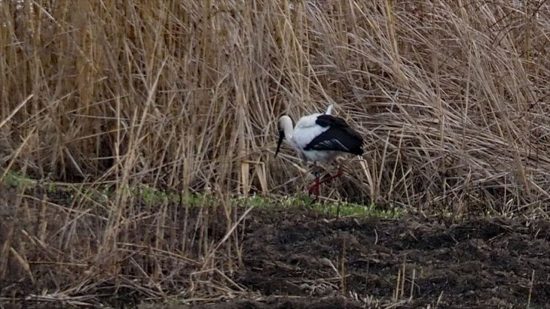 コウノトリ。土手にはカメラマンが三脚を立ててシャッターチャンスを狙っていました。
