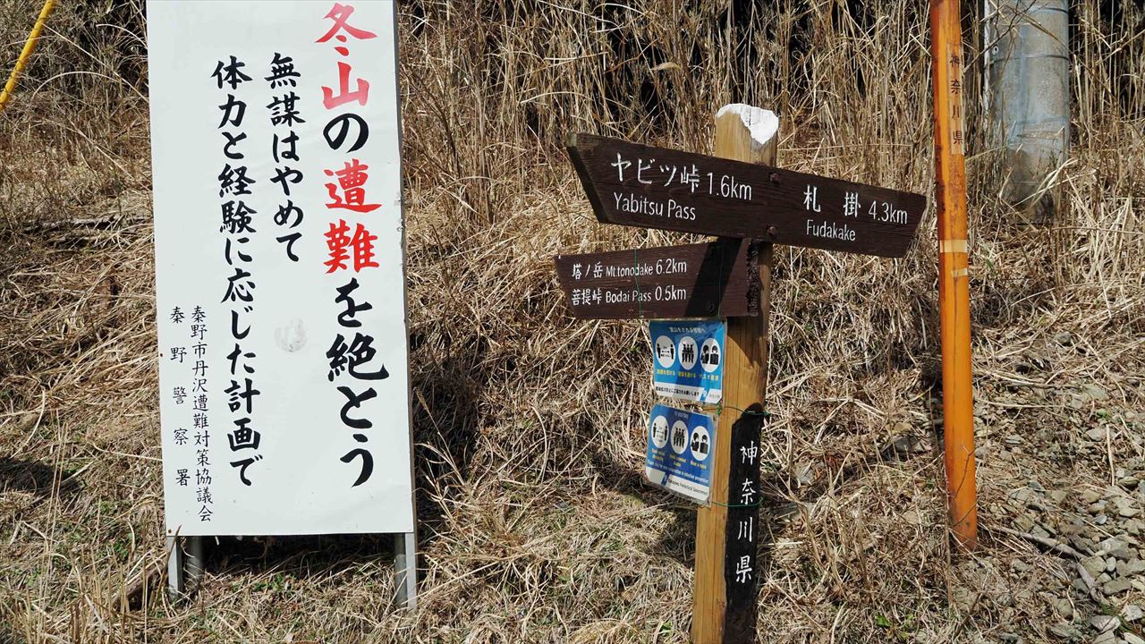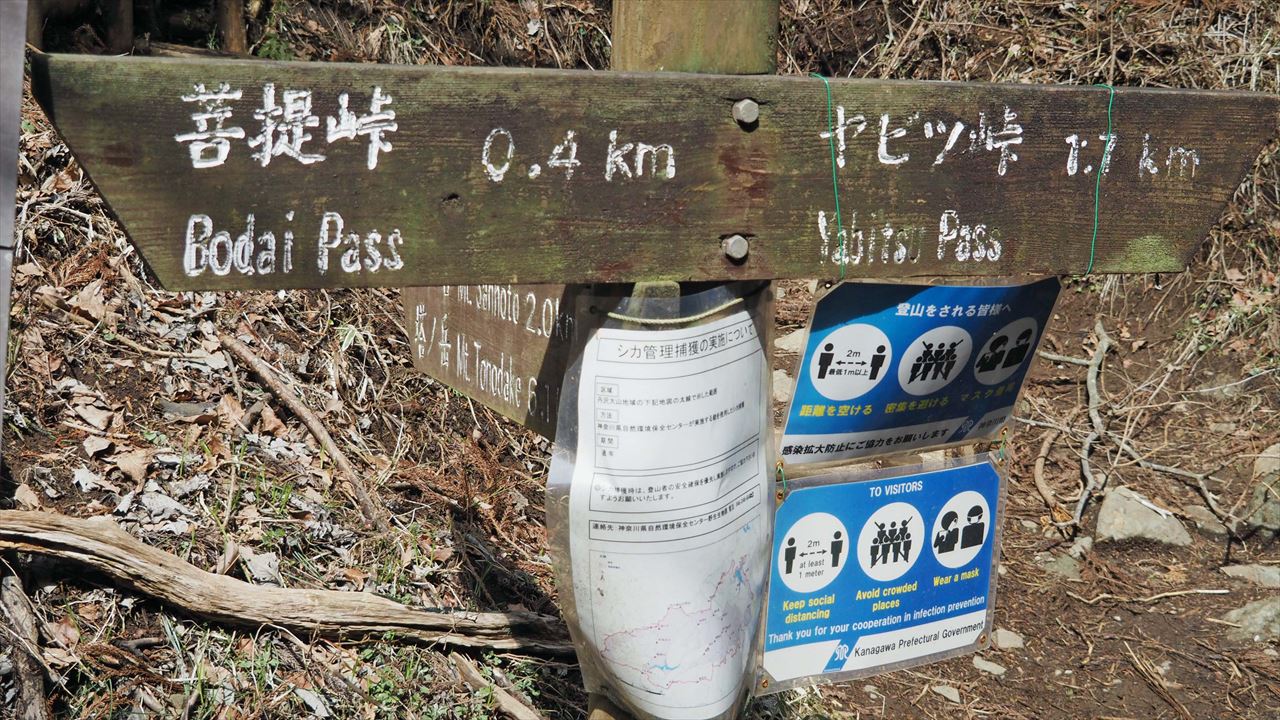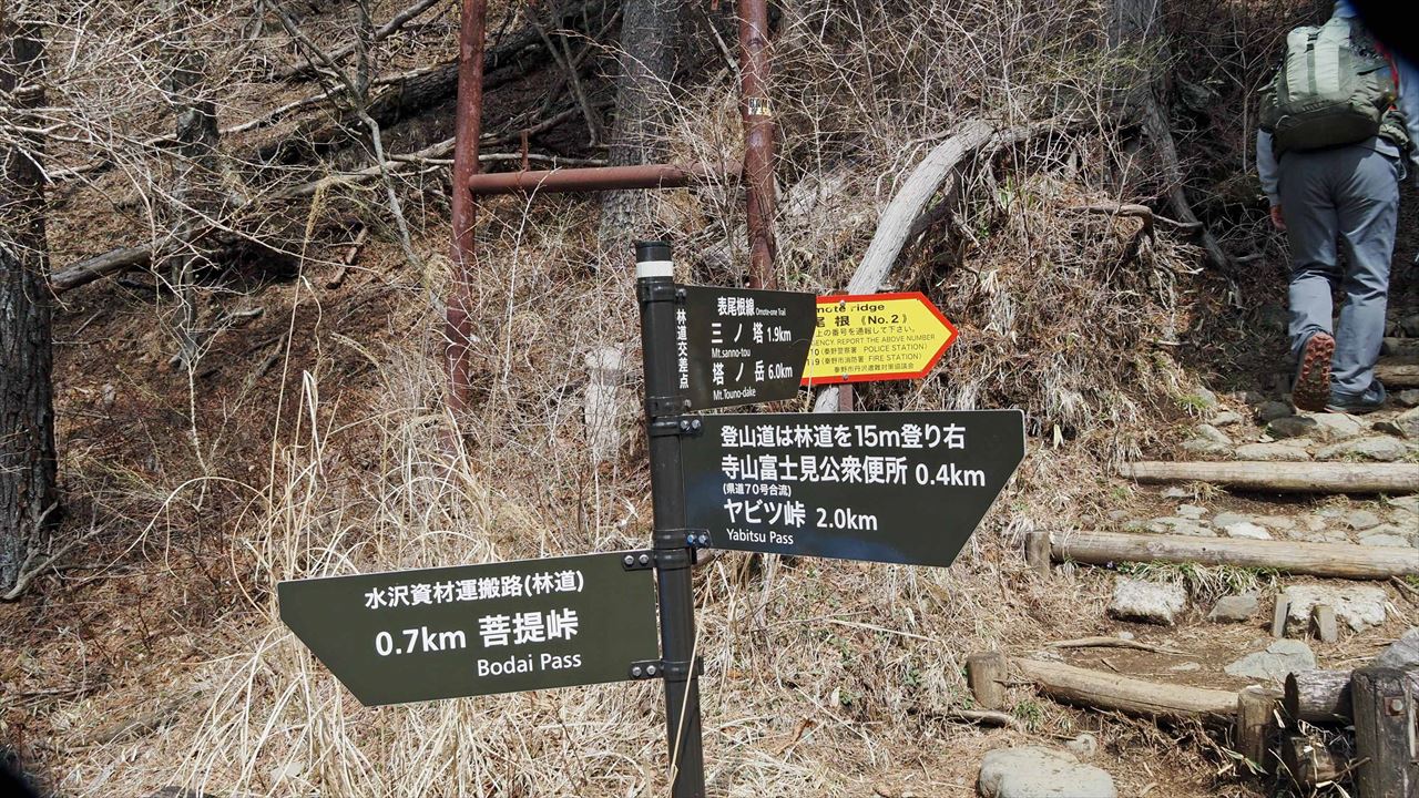 菩提峠分岐とWC、当初予定していた「青山荘~ヤビツ峠(門戸口コース)」でなく、復路は、青山荘~ここに戻って、ヤビツ峠へのコースに変更した。