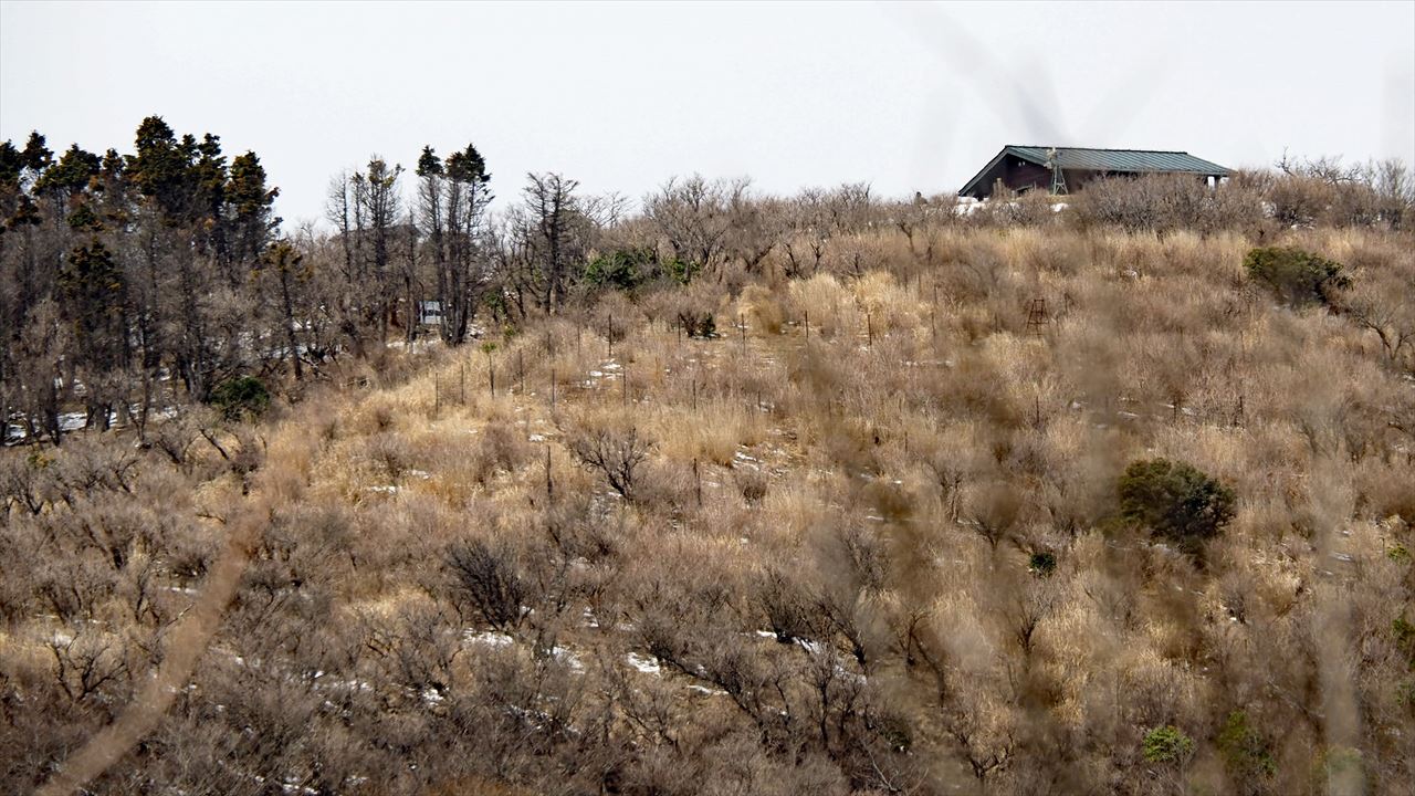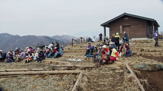 三ノ塔山頂にて昼食。後ろが避難小屋で、食事をしている前の建物はトイレ。