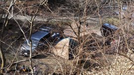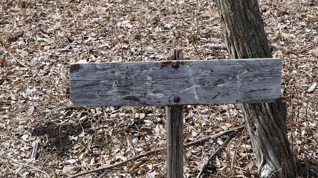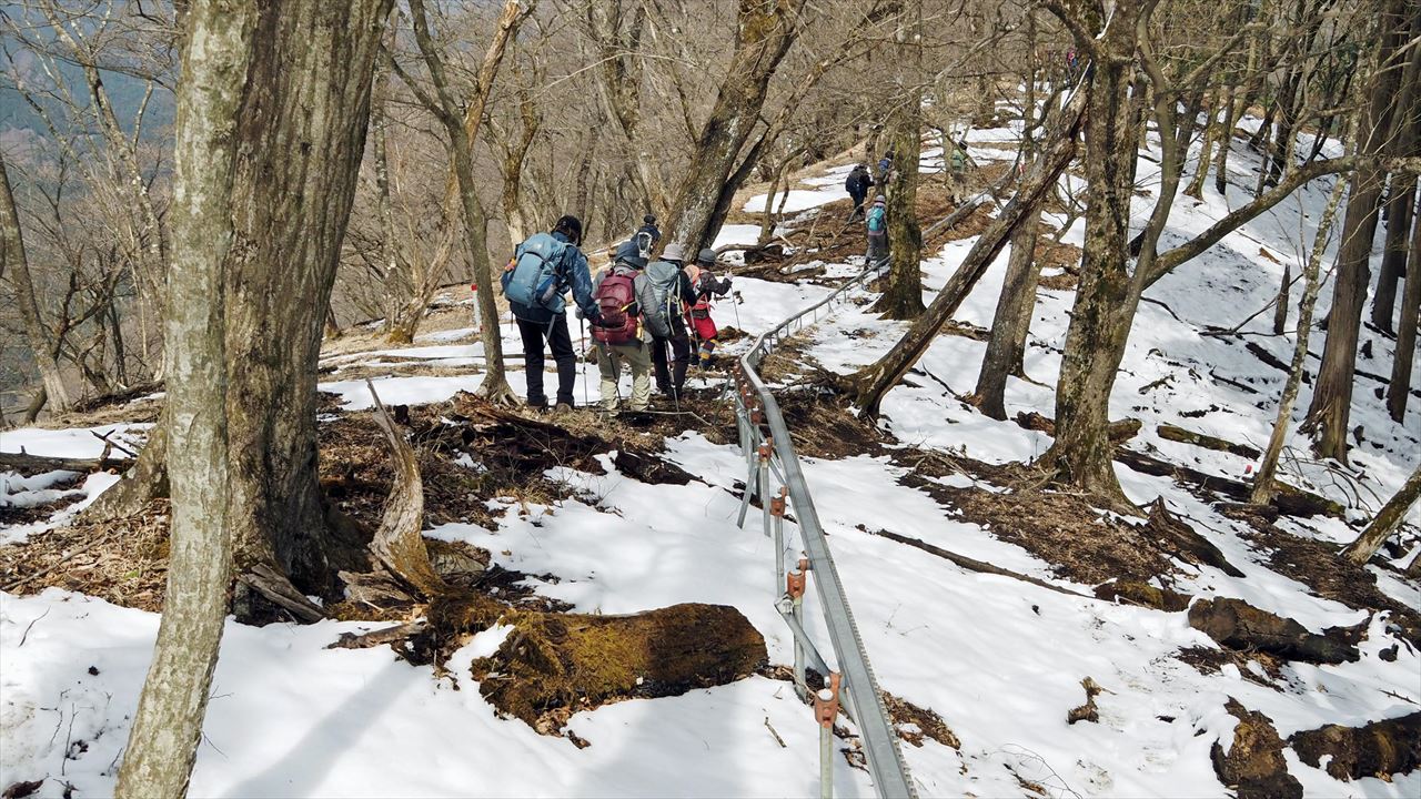 尾根道に積もった雪が、溶けて滑りやすかった。慎重に下りる。工事用物資の運搬用レールがあった。