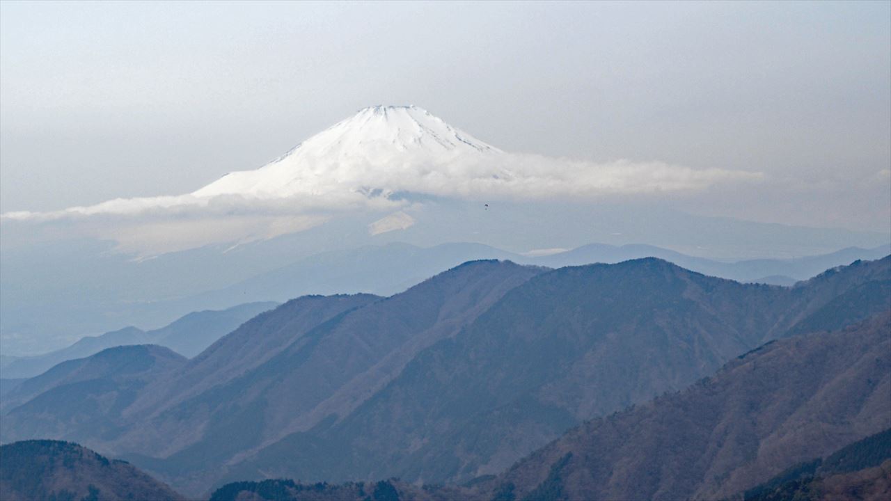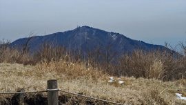 舗装道路を歩く。右手遠方に「丹沢三峰」を望む。すがすがしい気分だ。