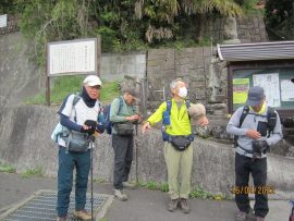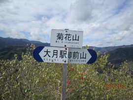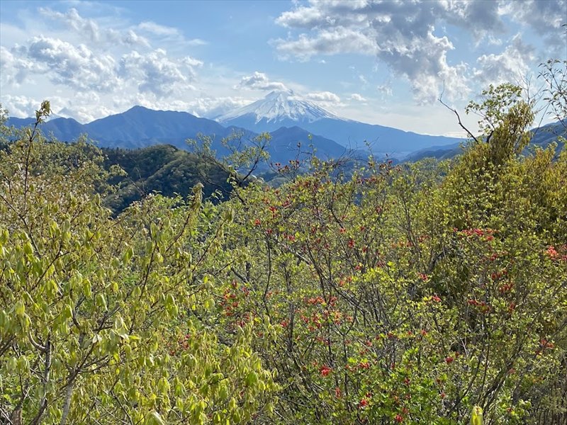 朝方まで降っていた雨も止み、禾生駅から歩き神社脇の登山口から九鬼山を目指して登り始める。天狗岩を経て九鬼山の山頂からはガスがかかった合間から時々山並が見られるが、富士山は見えず、九鬼山からの急な坂を下り、アップダウンを繰り返しながら各ピークを越えていく。新緑の中の山ツツジの赤い花が疲れを癒してくれる。岩場を越えて菊花山の山頂に着くとようやく、富士山が見られる。急坂を下り、皆さんのご協力を頂き、下山できました。ありがとうございました。