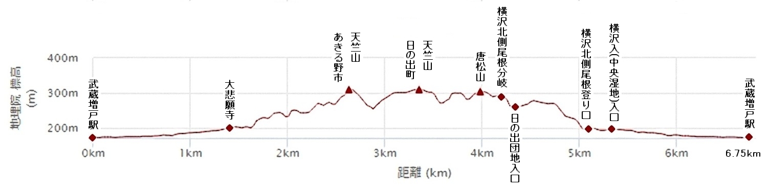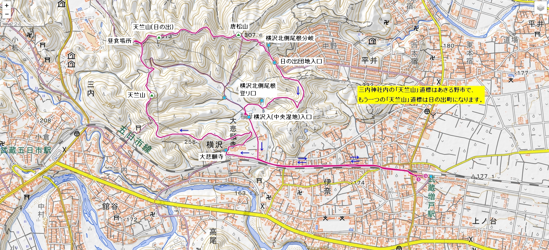 | 唐松山・三等三角点 | 日の出団地 | 「横沢入」手前の急坂 |