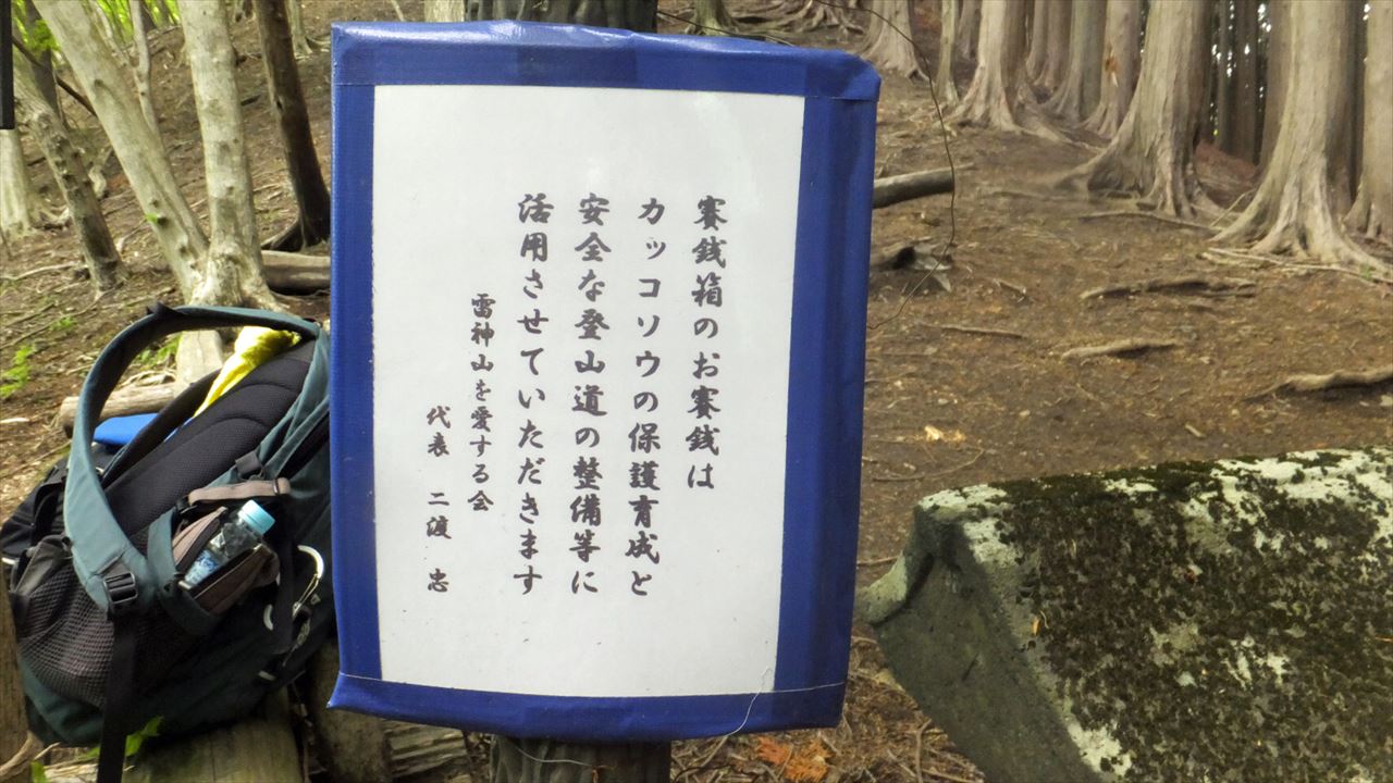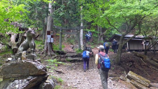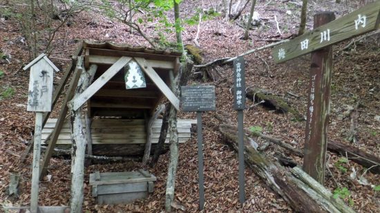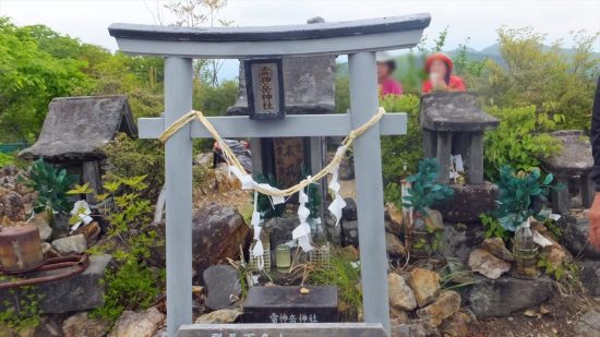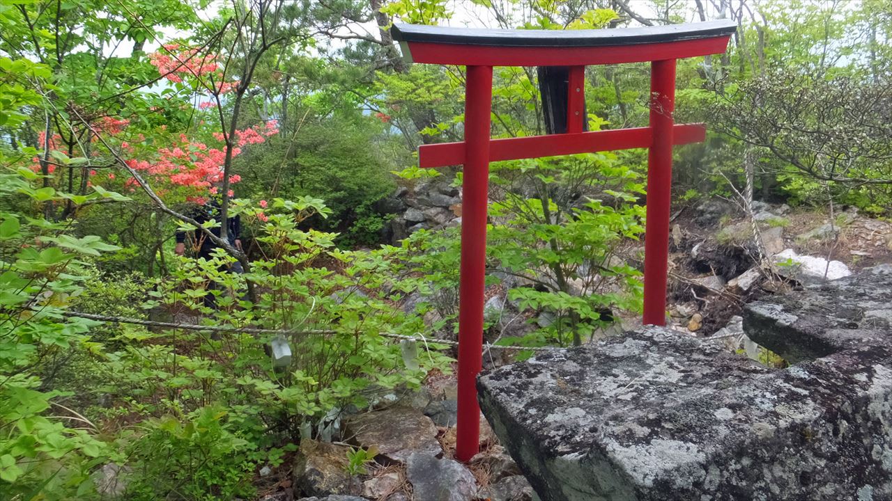 小さな鳥居の前に賽銭箱。カッコソウの群落地にくだり、ここに戻る。