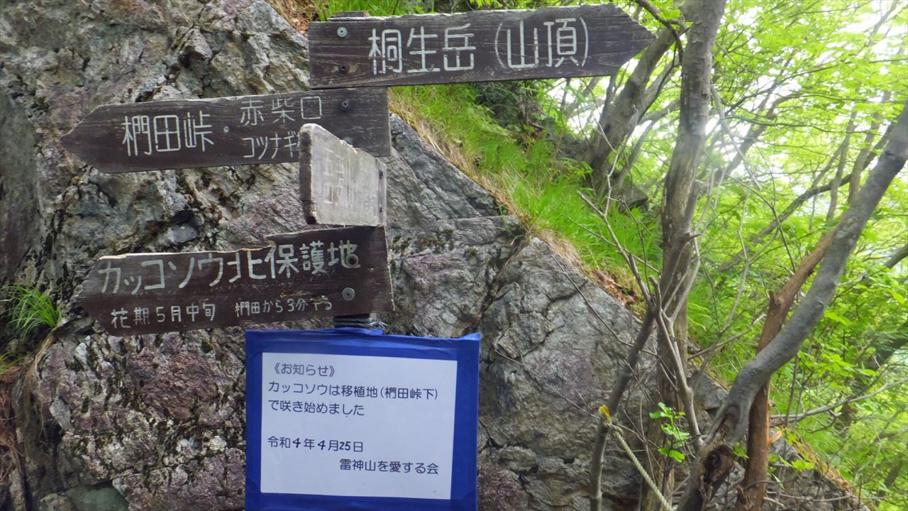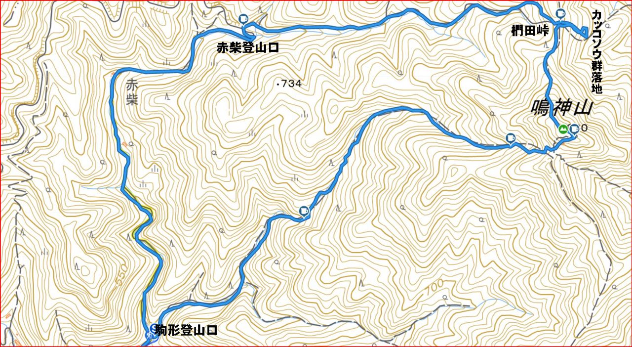 桐生駅、タクシー=駒形登山口10:45→肩の広場12:40→12:50鳴神山(桐生岳)昼食13:20→仁田山岳13:30→椚田峠13:50→カッコソウ群落地→椚田峠14:15→赤柴登山口14:50→15:25駒形登山口、タクシー=桐生駅