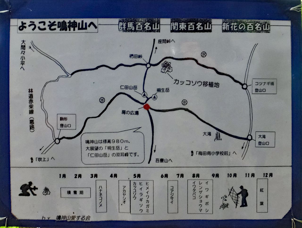 鳴神山(980m)は、群馬県桐生市の北に位置する双耳峰の山です。地元では古くから信仰の山として崇められ、それぞれのピークには雷神(なるかみ)が住む山として親しまれている。また、関東百名山、新花の百名山、群馬百名山に選ばれている。
