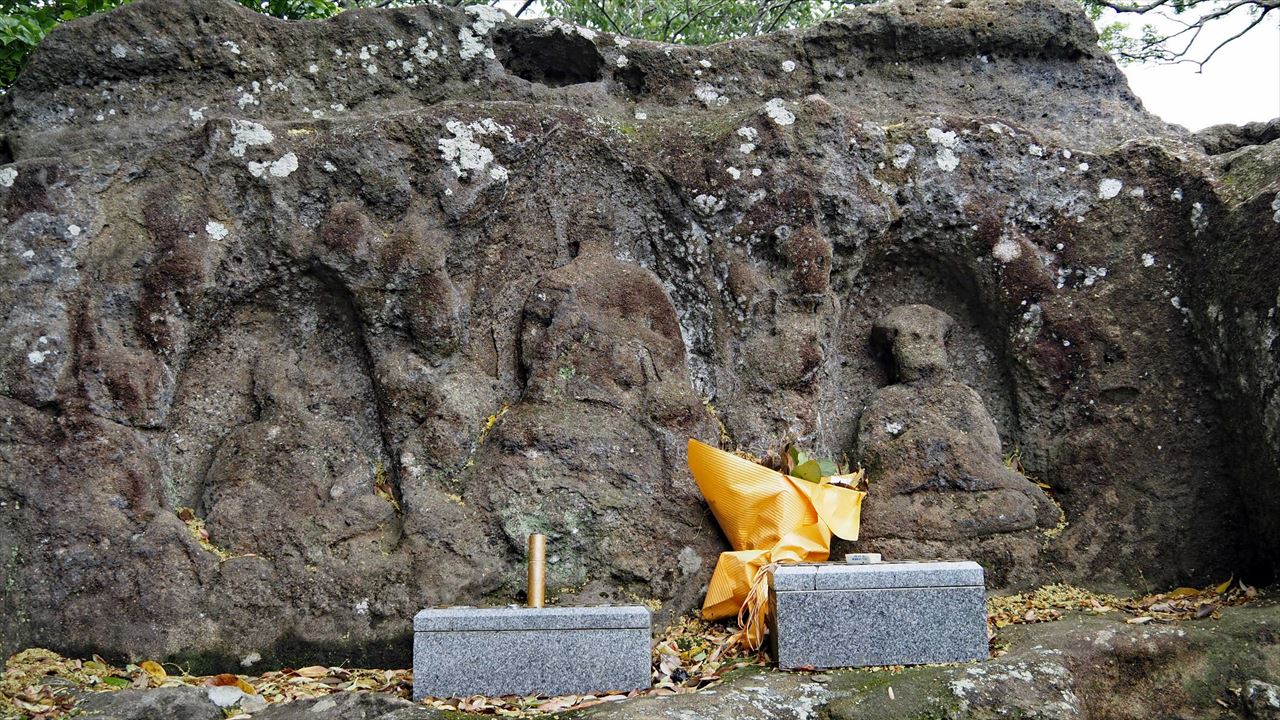 冥界の判事である十王のうち、閻魔など三王が浮き彫りされている。
