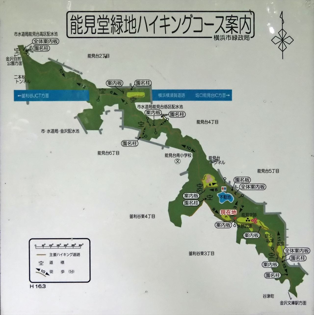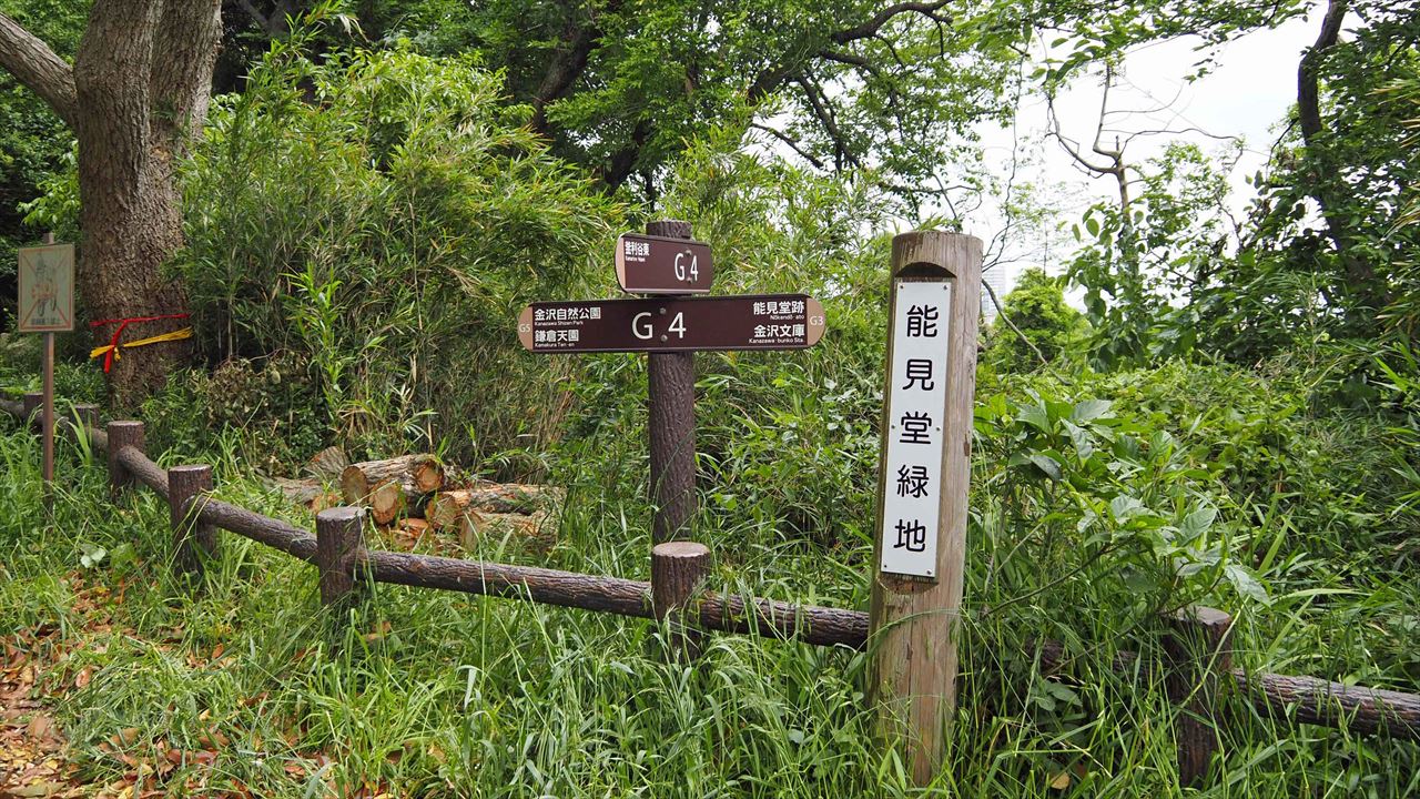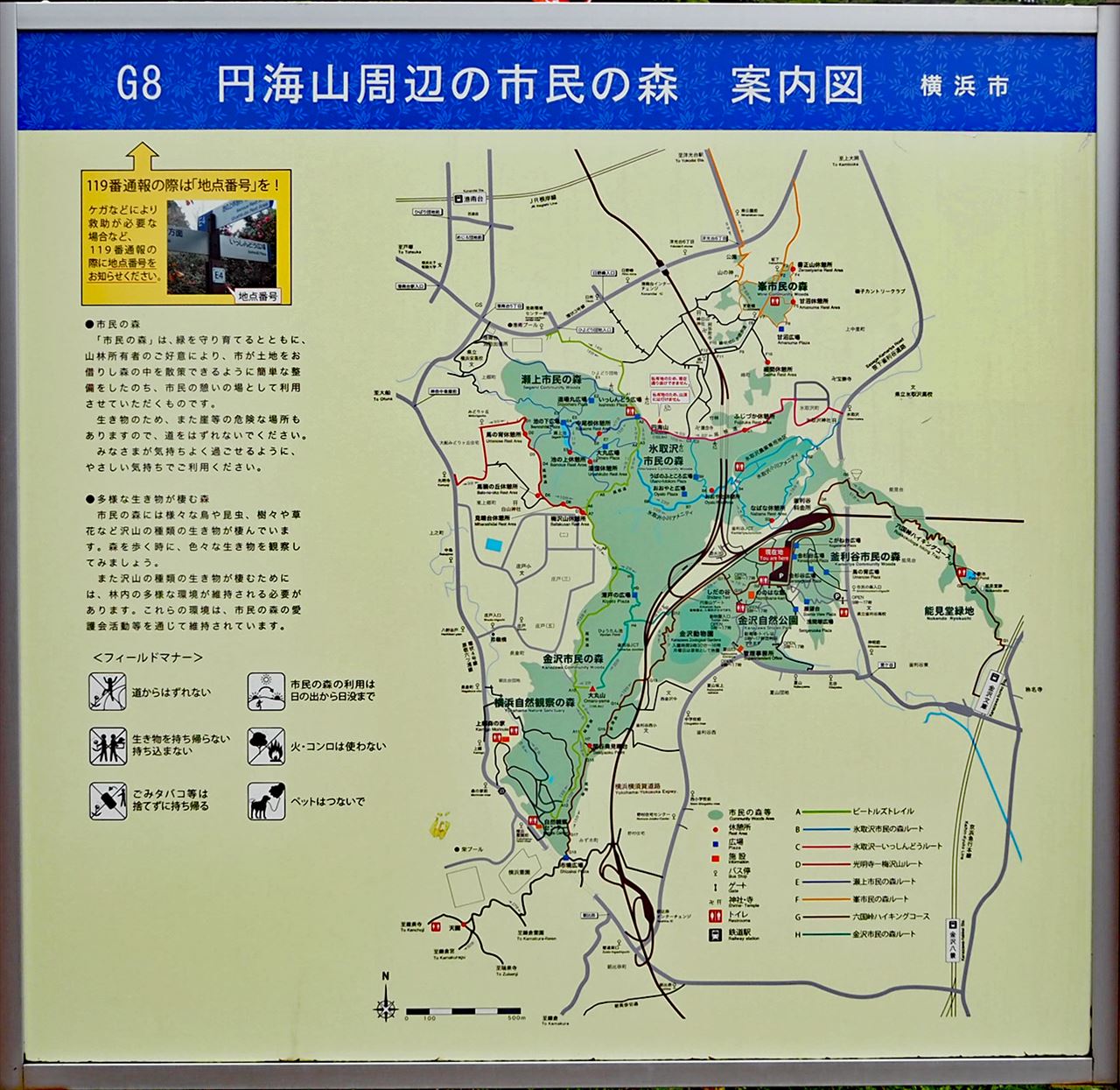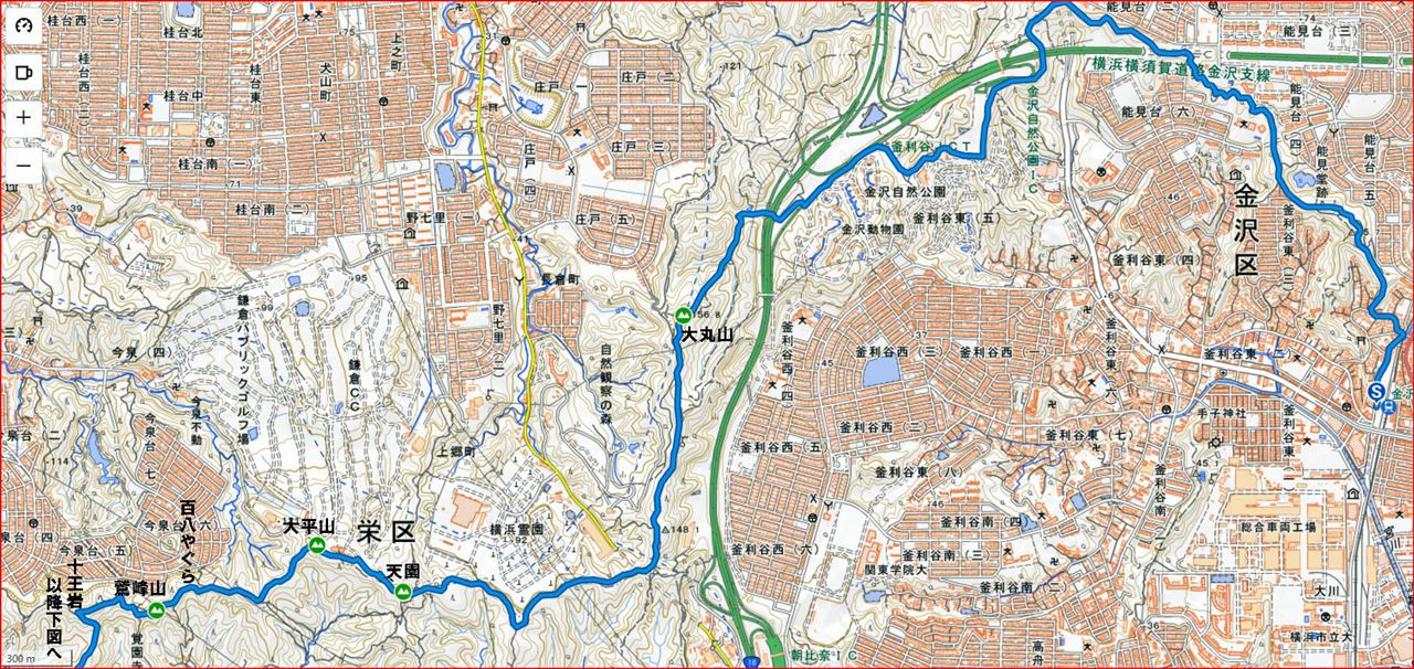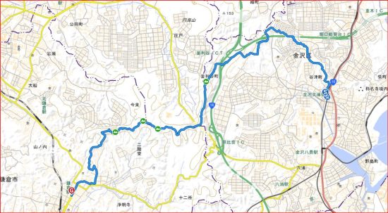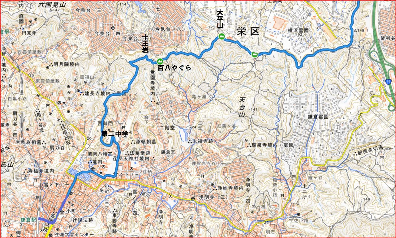 京急金沢文庫9:05→9:15六国峠ハイキングコース入口→能見堂跡9:35→金沢動物園10:35→11:30大丸山(昼食)12:10→大平山13:30→百八やぐら14:00→十王岩14:30→グリーンコース→鎌倉市立第二中学校15:45→鶴岡八幡宮16:00→JR鎌倉駅16:10