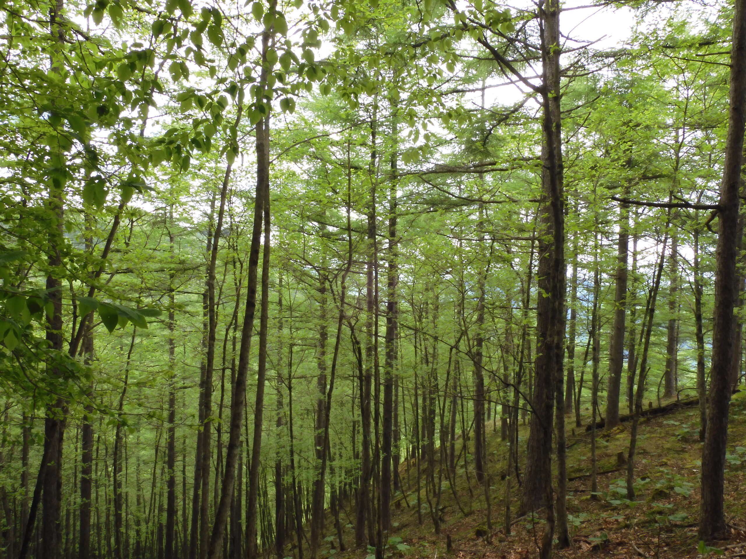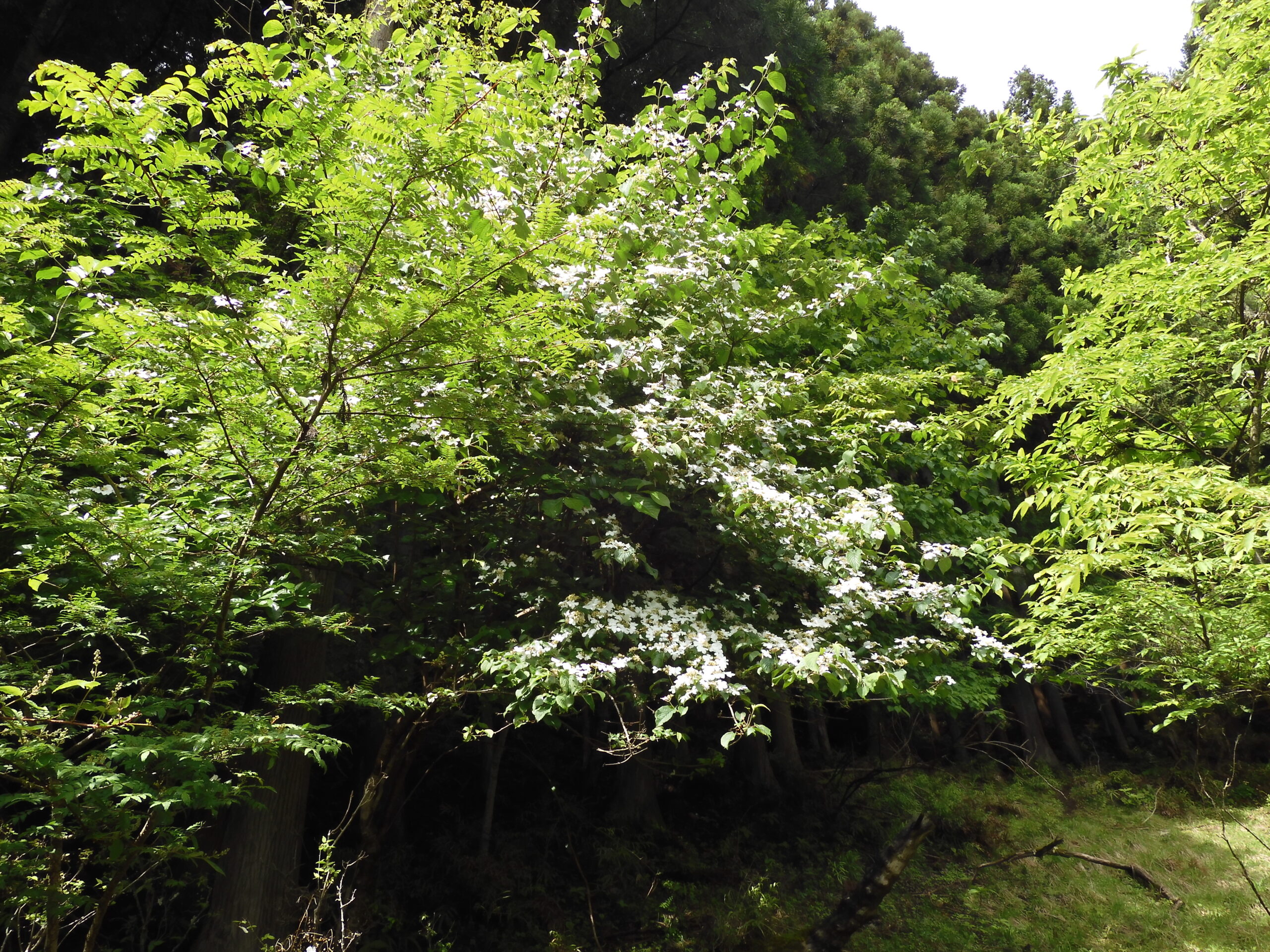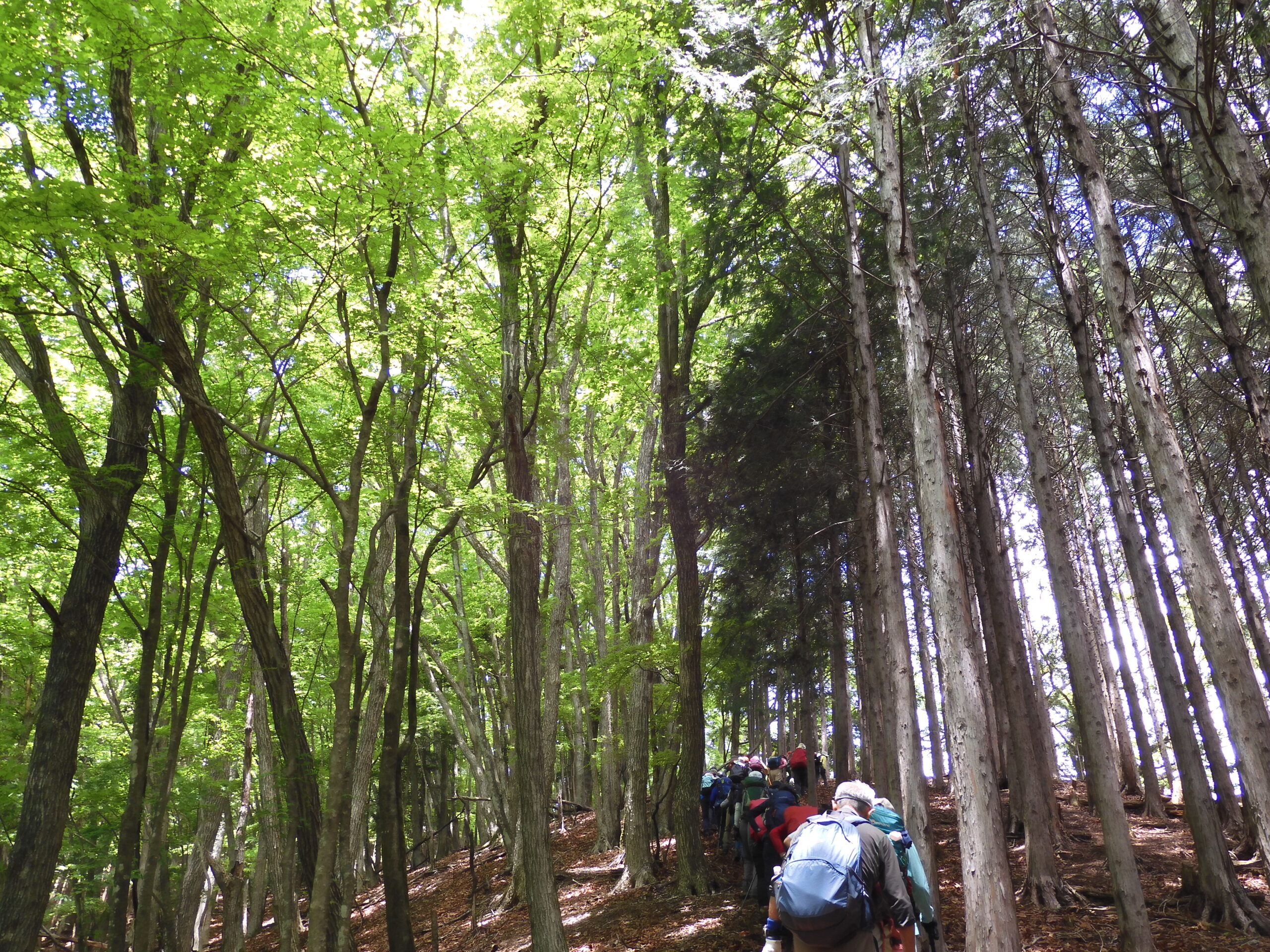 六ツ石山山頂近くの防火帯を登り周りの雑木林は濃くなった緑が前日の雨で鮮やかである❕