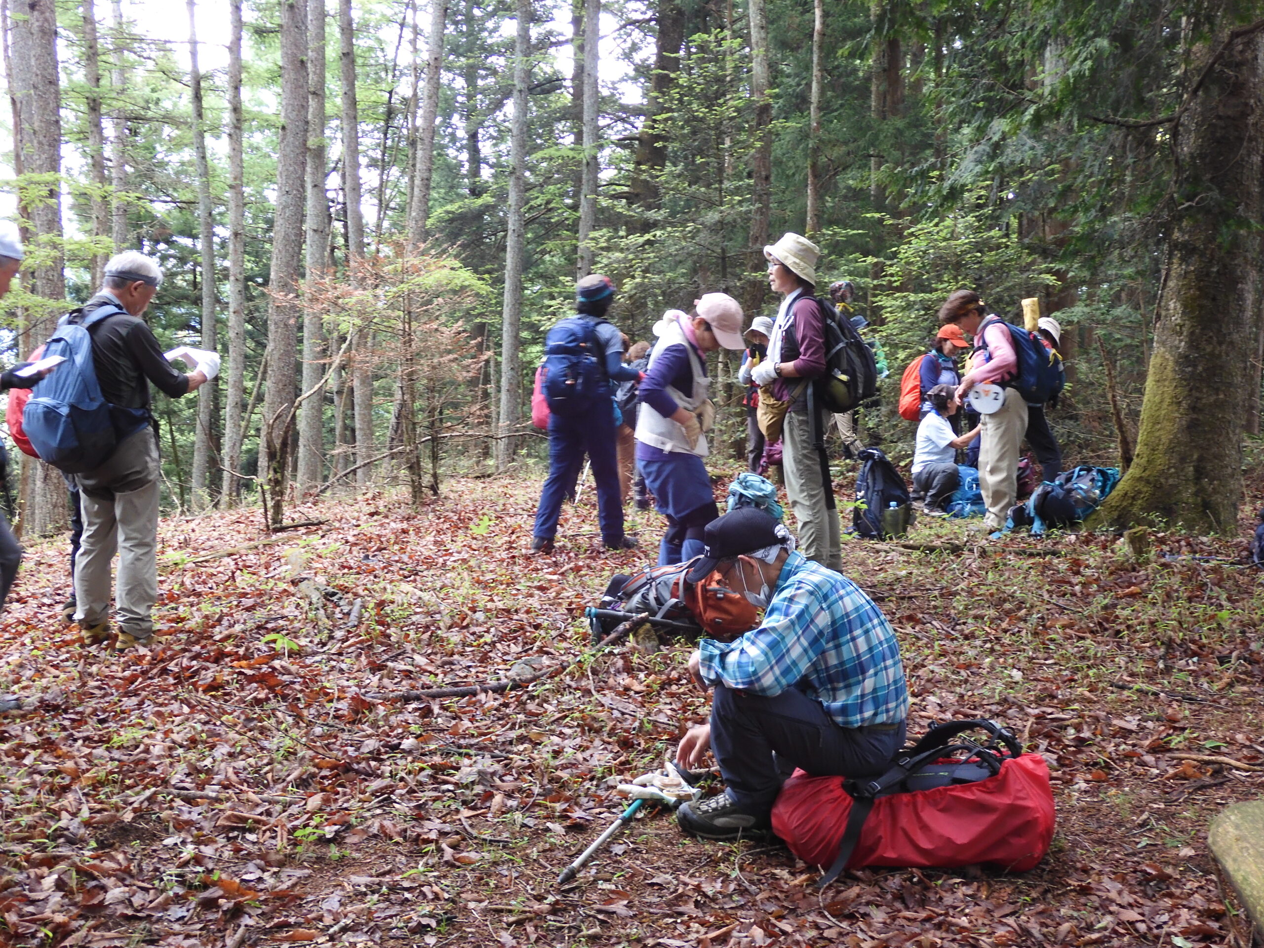 杉林中の登山道、前日の雨で足元がスベル イソツネ山で一本いれる