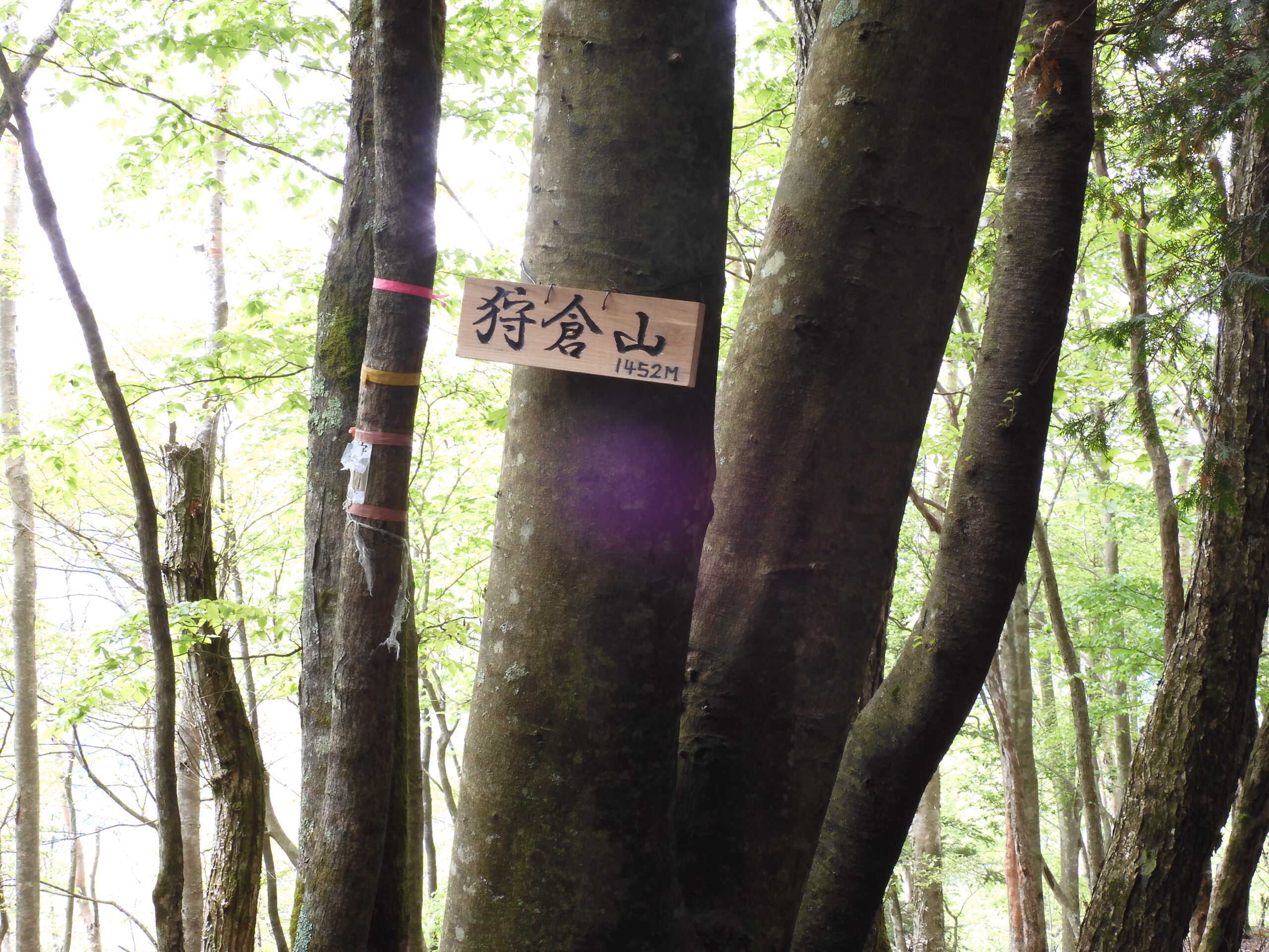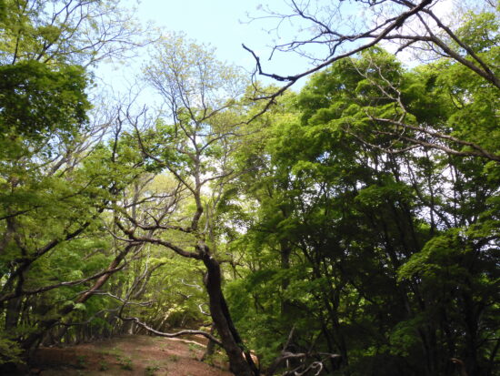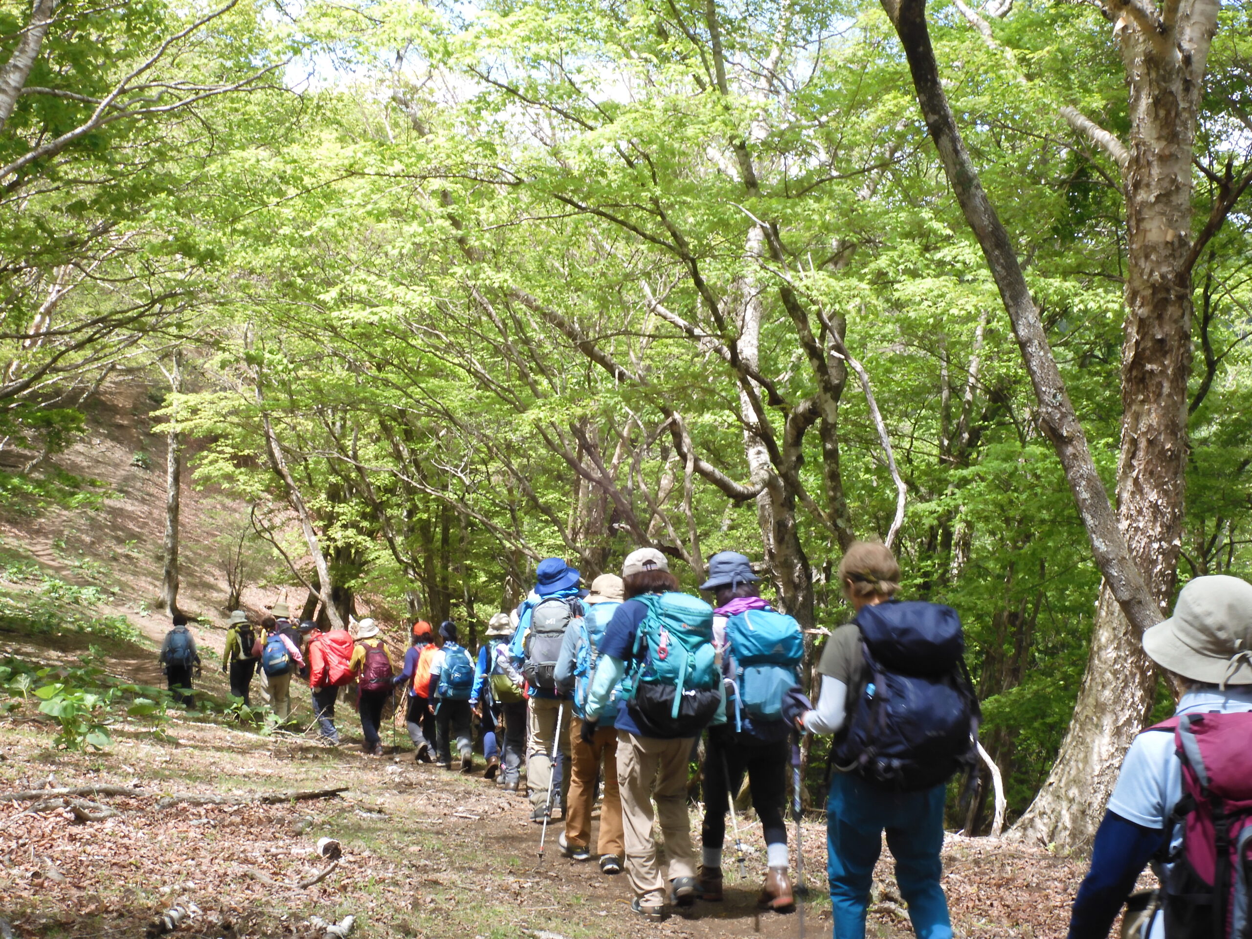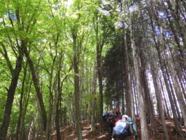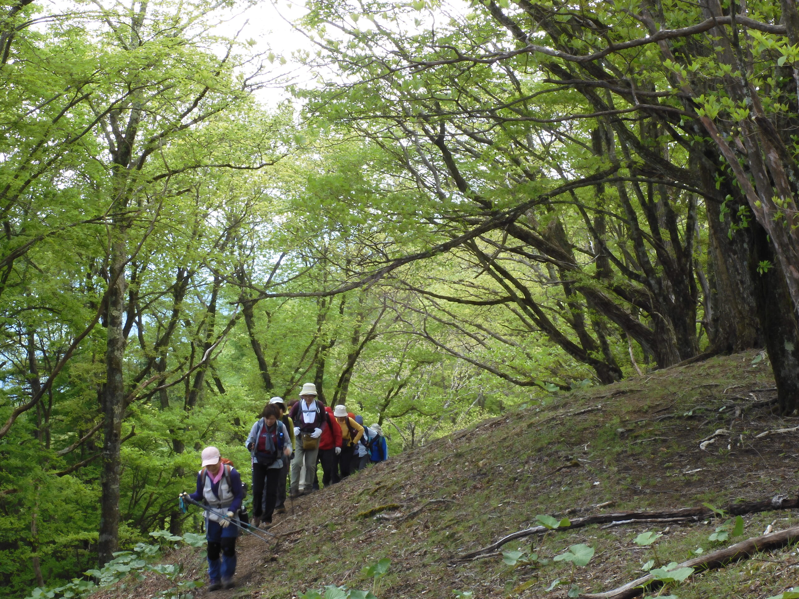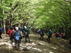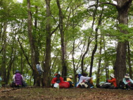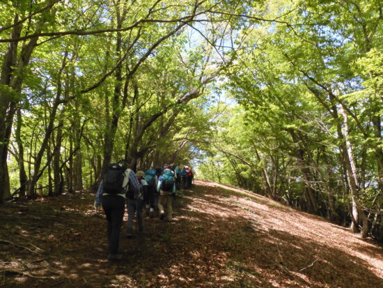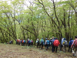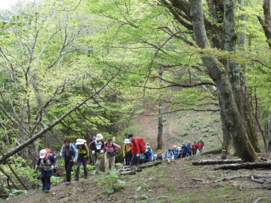 ▼コメント:21日は降雨予報のため22日に変更しました。イソツネ山、狩倉山、三ノ木戸山と寄り道しての長丁場をブナ林の美しい新緑とヤマツツジに助けられて皆様、頑張りました。