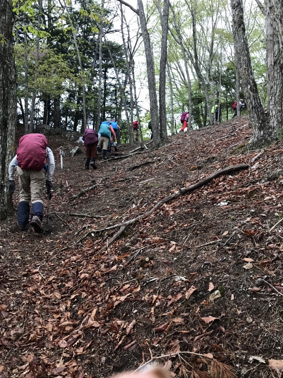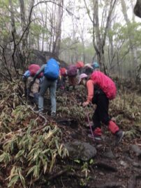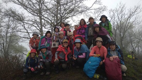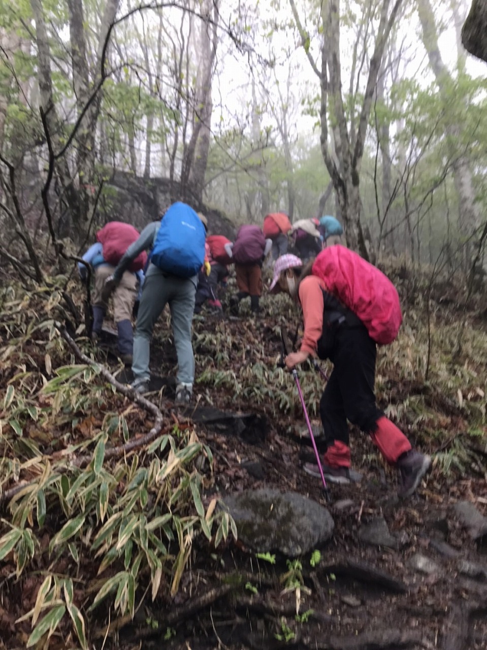 山川リーダー、スタッフの皆様、お疲れさまでした。宿泊山行は、見知らぬ土地を訪ね、未踏の山を訪ねる楽しさがあります。初めての山を、晴れた日に木漏れ日の中を歩くのは気持ち良いですが、幻想的な霧の中を歩く冒険感もまた楽しいです。急登あり、ロープありを歩き、辿り着いた山頂は霧の中、、、これも山の醍醐味です。山の天気は変わりやすいと言いますが、幻想的な聖域に踏み込んでいき、次第に雲が晴れ、飯盛山からの大パノラマ。この醍醐味が病みつきになるのです。いつも安全で楽しい山行をありがとうございます。