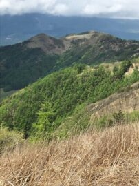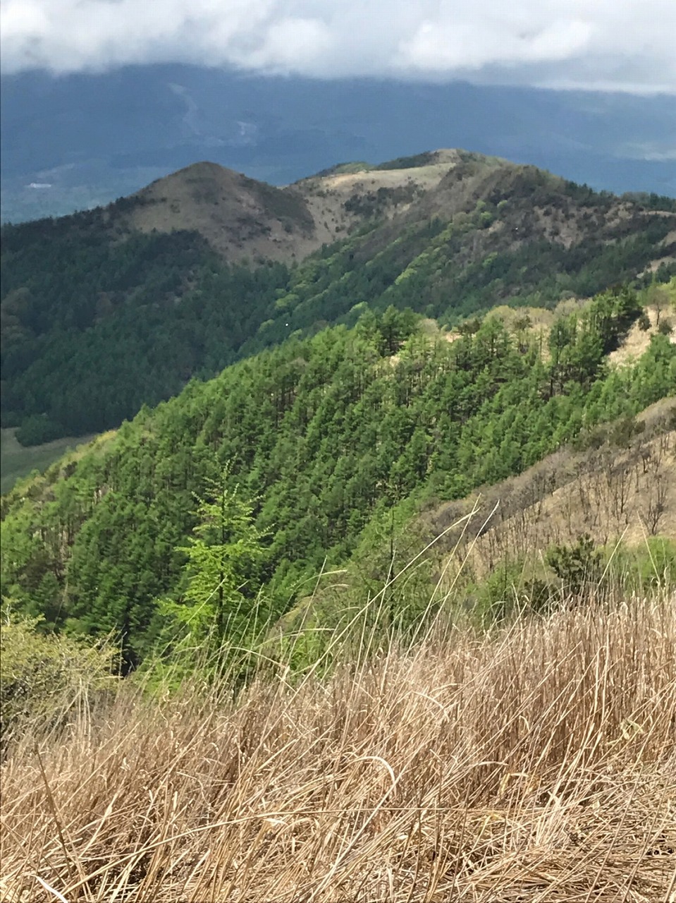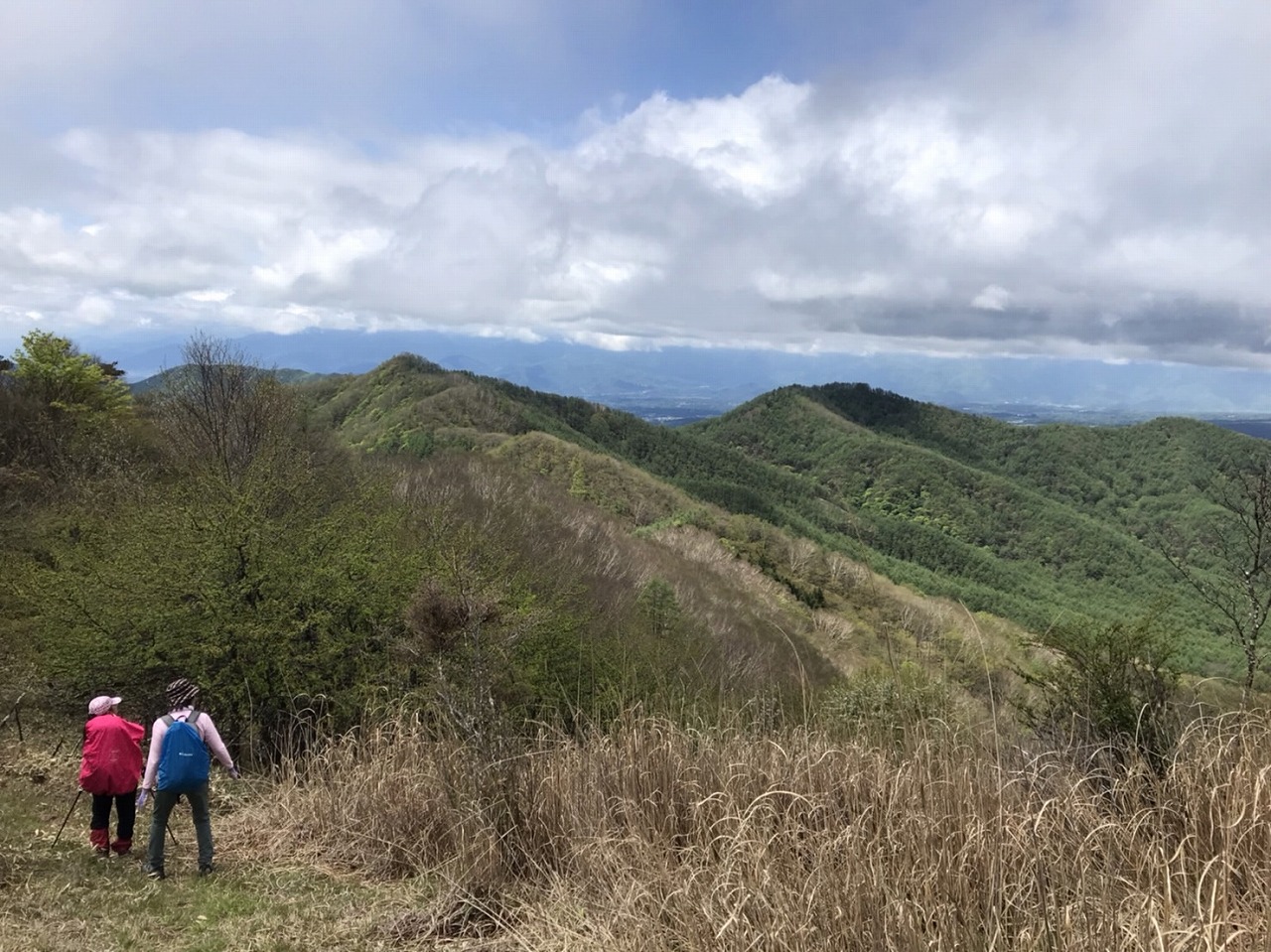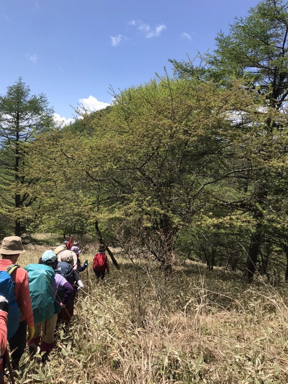「横尾山は東西に長く、太平洋に流れる富士川と日本海へ流れる千曲川→信濃川の分水嶺になっている。山梨百名山の一つであり、展望の良さで知られている。今回は天気の回復が遅れて横尾山での望みは叶わなかったが、回復後のコースは申し分のない素晴らしい展望で、広がる高原には芽吹きのカラマツ、ミツバツツジとズミの花も愛らしい。そして目指して歩いて来た先にとうとう見えた飯盛山の遠景に思わず上がる歓声に押されて最後の登りに精が出る。お互い頑張ったね。