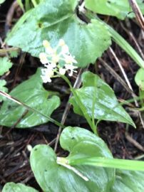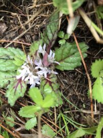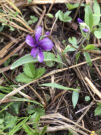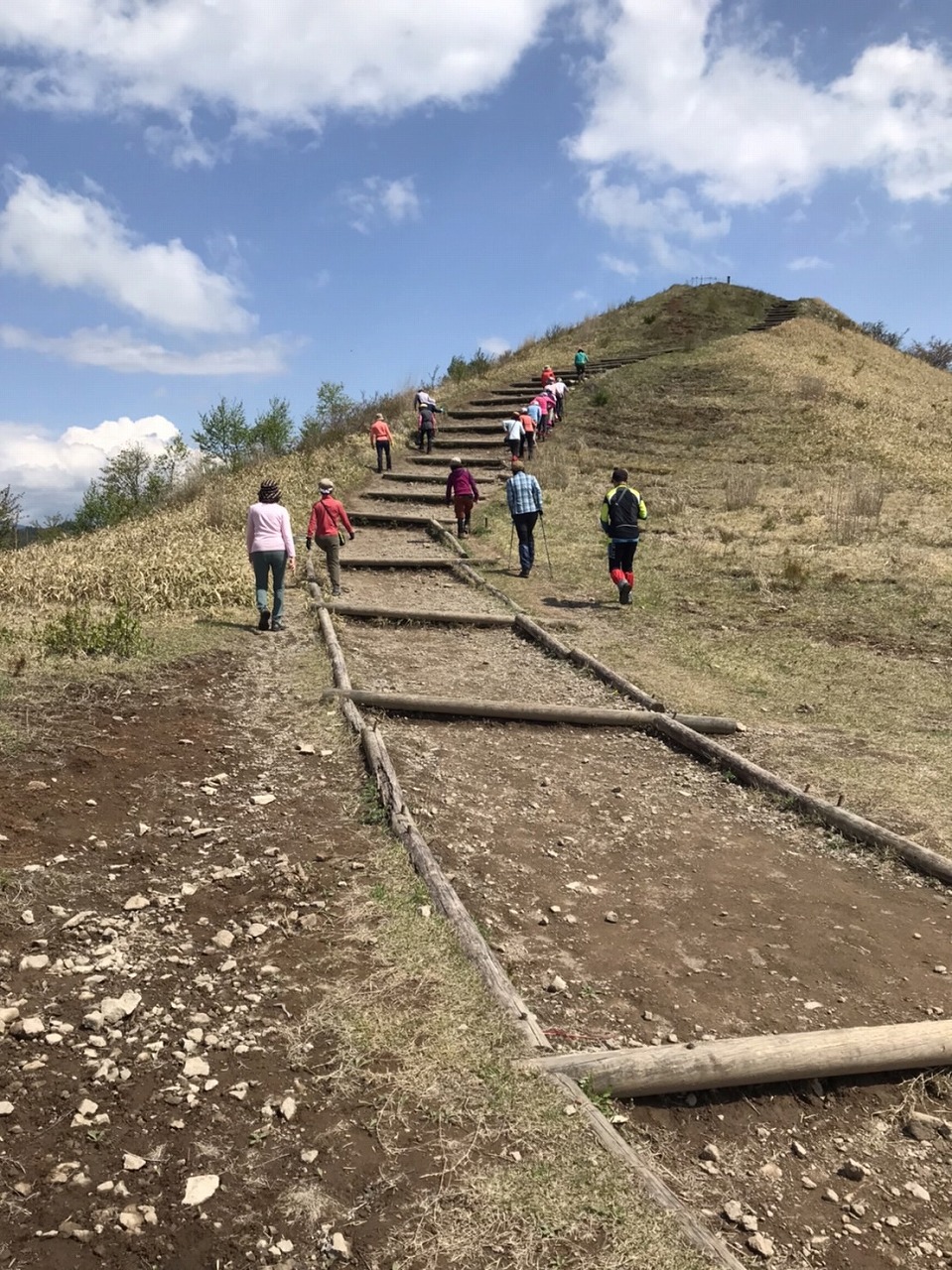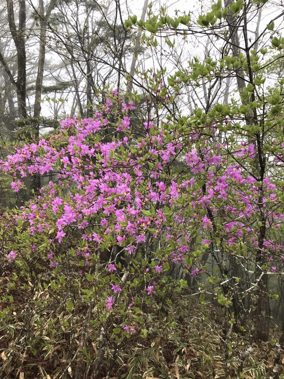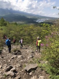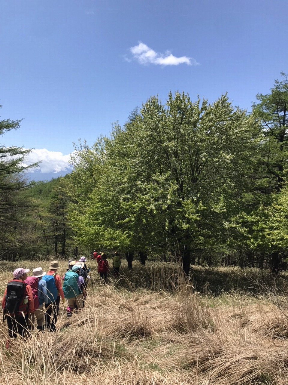 「横尾山は東西に長く、太平洋に流れる富士川と日本海へ流れる千曲川→信濃川の分水嶺になっている。山梨百名山の一つであり、展望の良さで知られている。今回は天気の回復が遅れて横尾山での望みは叶わなかったが、回復後のコースは申し分のない素晴らしい展望で、広がる高原には芽吹きのカラマツ、ミツバツツジとズミの花も愛らしい。そして目指して歩いて来た先にとうとう見えた飯盛山の遠景に思わず上がる歓声に押されて最後の登りに精が出る。お互い頑張ったね。