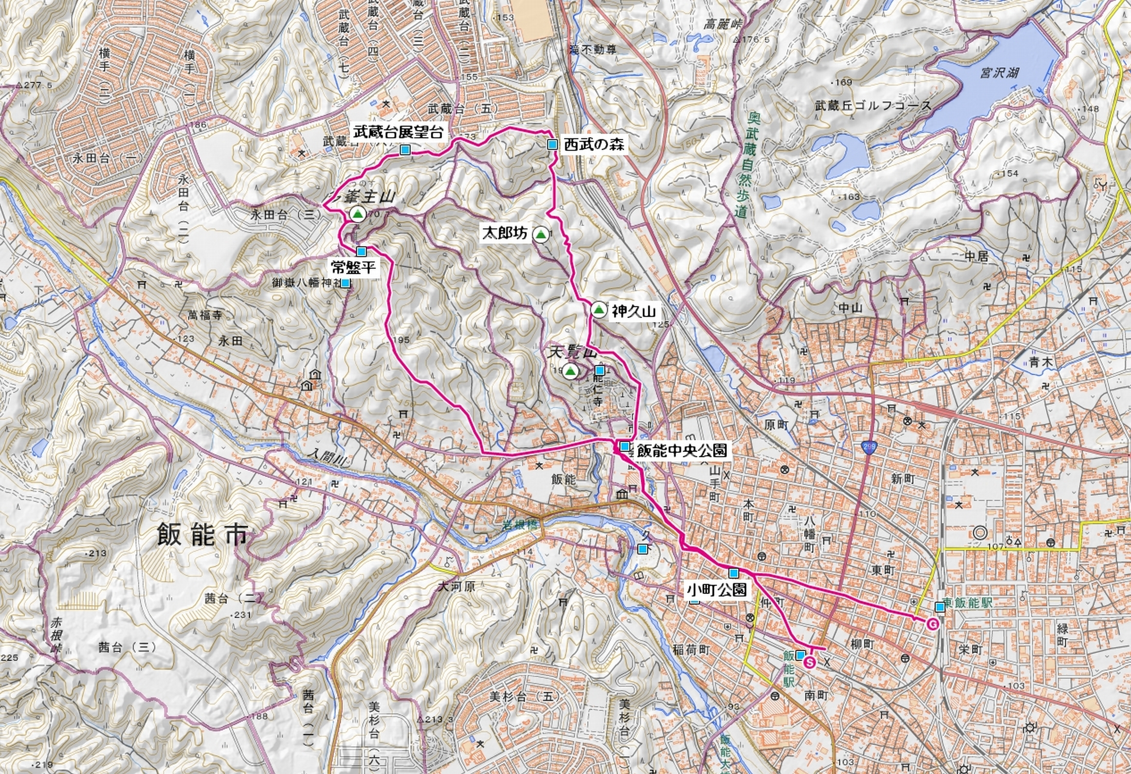 | 神久山標識 | 能仁寺入口方向に進む | 飯能中央公園で解散 |