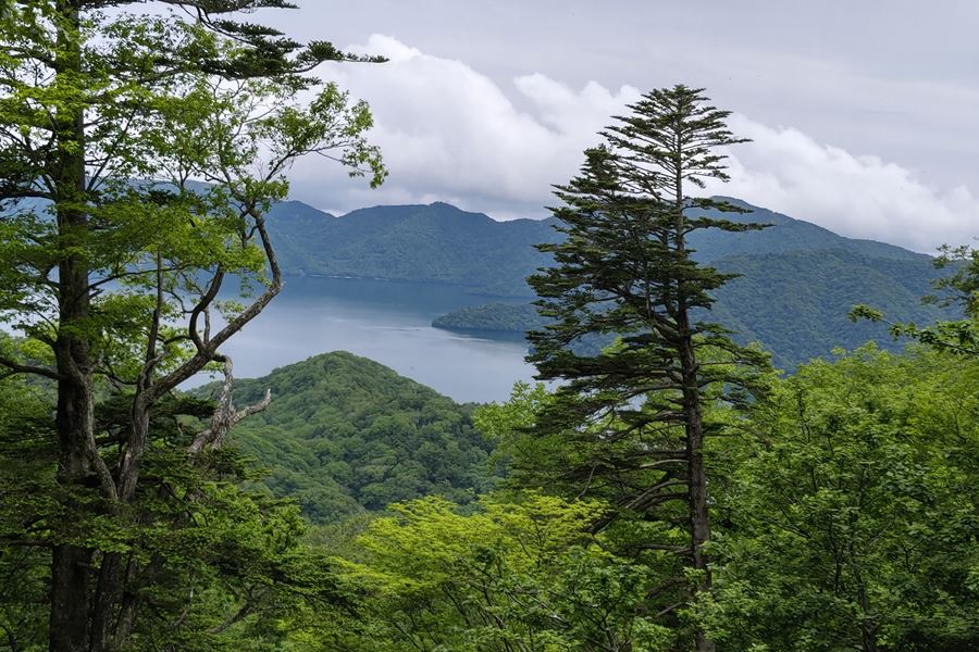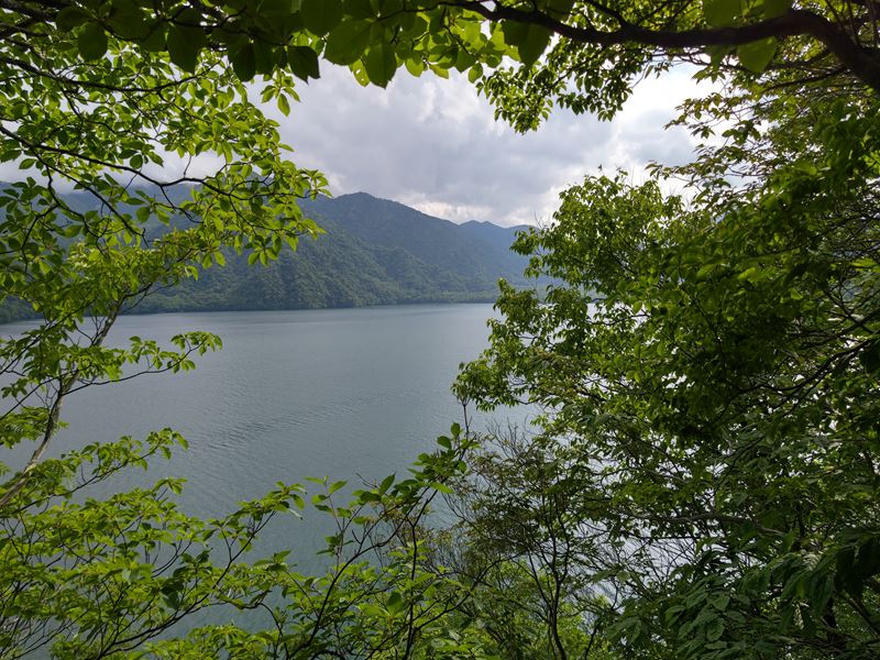 ルート上の樹間から日光連山や中禅寺湖の水面を観ながら参加者