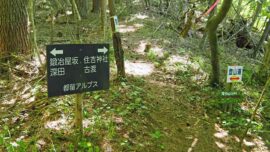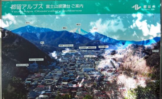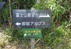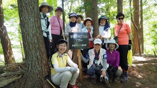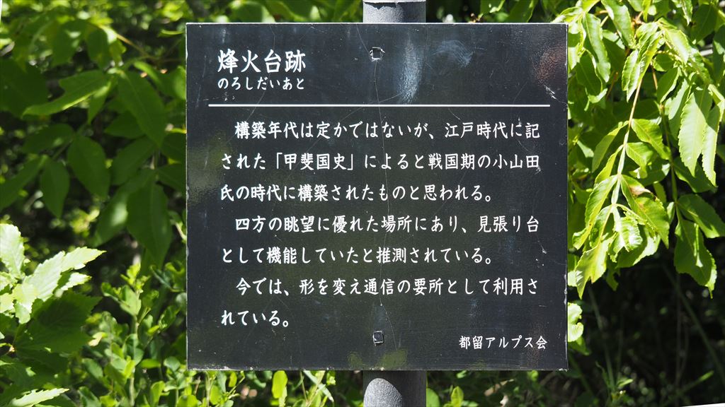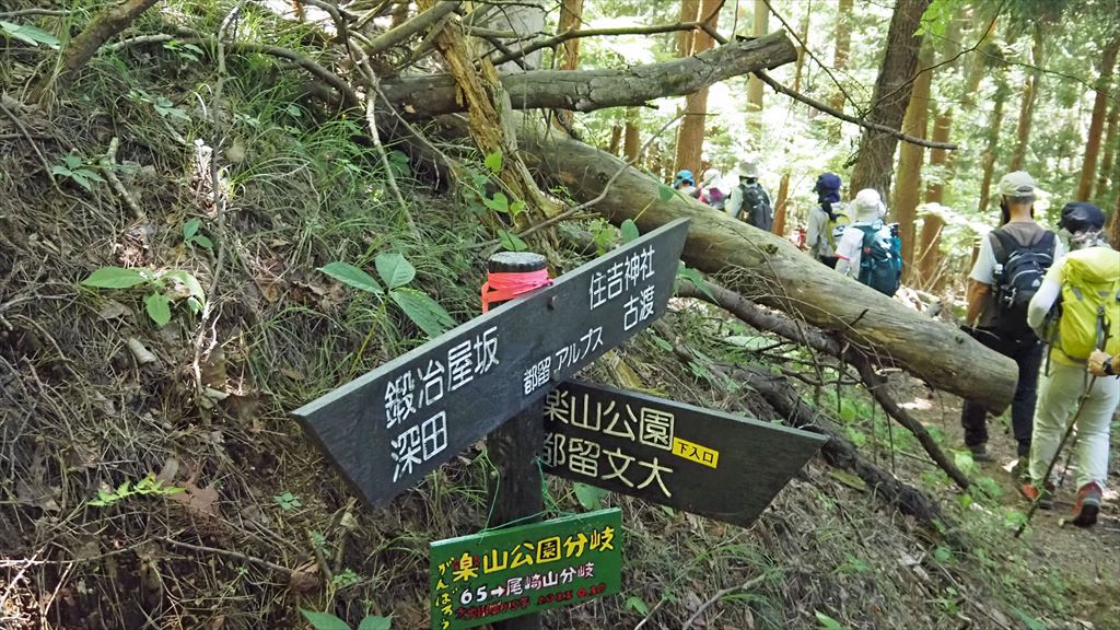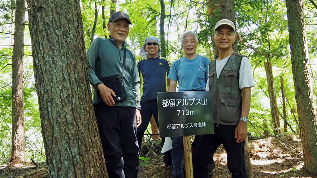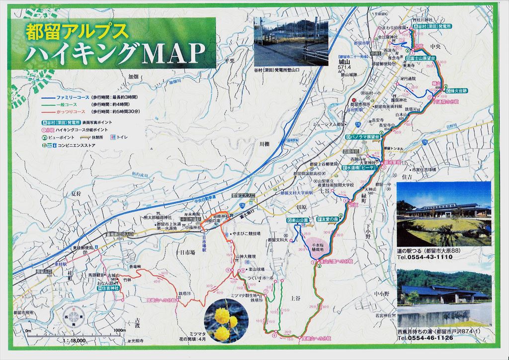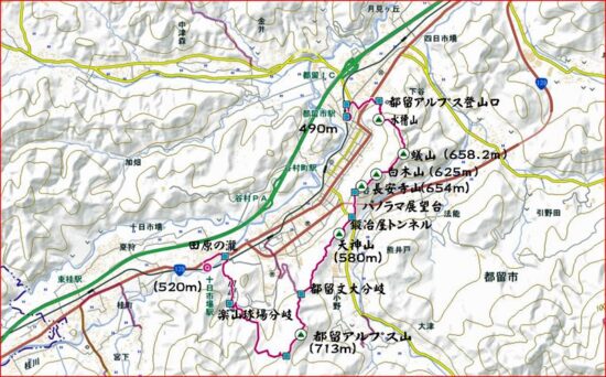 都留市駅8:50→都留アルプス東側登山口9:07→蟻山10:05→白木山10:25→長安寺山10:37→パノラマ展望台10:45→10:55鍛冶屋坂トンネル上(昼食)11:30→天神山11:38→都留アルプス山(713m)13:11→十日市場駅14:30