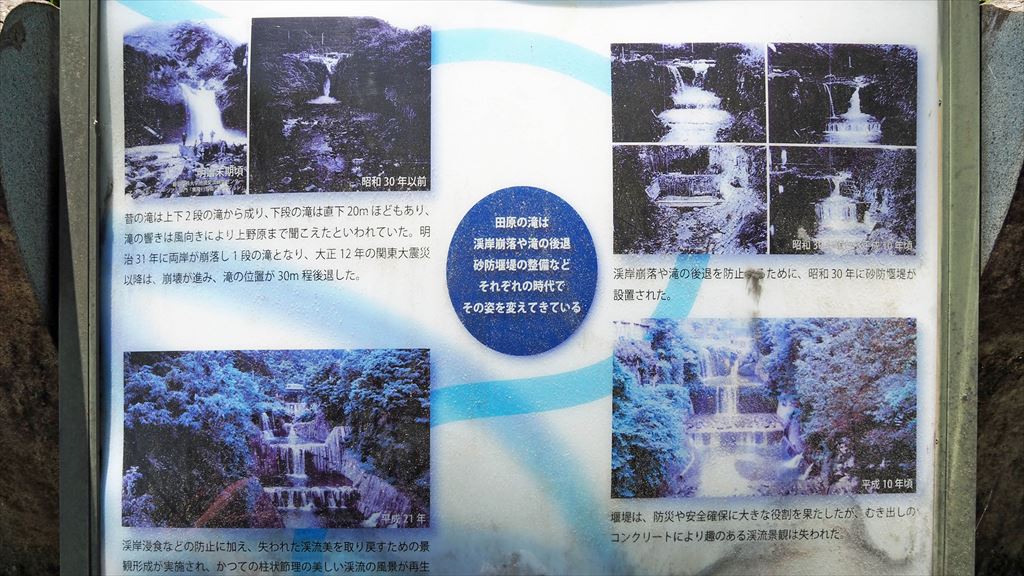 田原の滝は溪岸崩落や滝の後退、砂防堰堤の整備などそれぞれの時代でその姿を変えてきている。