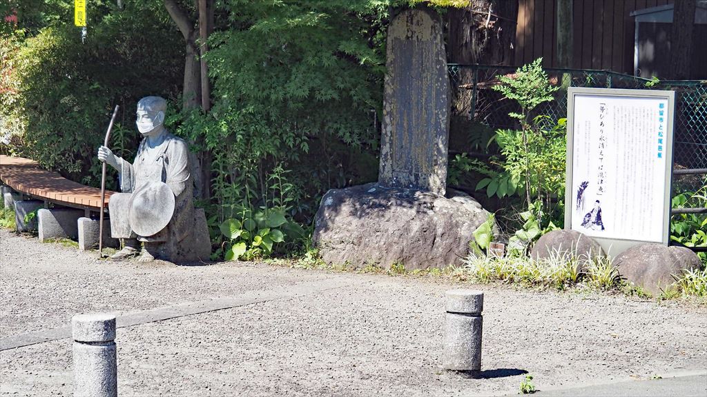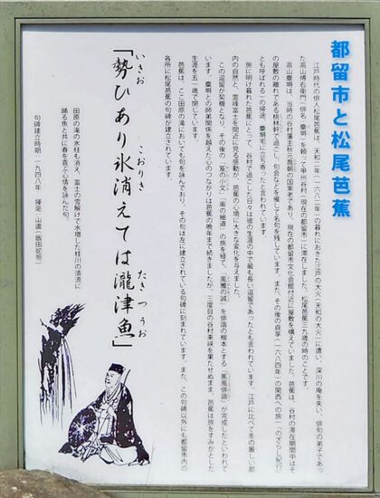 松尾芭蕉39歳の時、天和2年(1682)の暮れに起きた、江戸の大火に遭い、深川の庵を失い、俳句の弟子であった高山伝右衛門(谷村藩の国家老)をたよって甲州谷村(現在の都留市)に滞在しました。