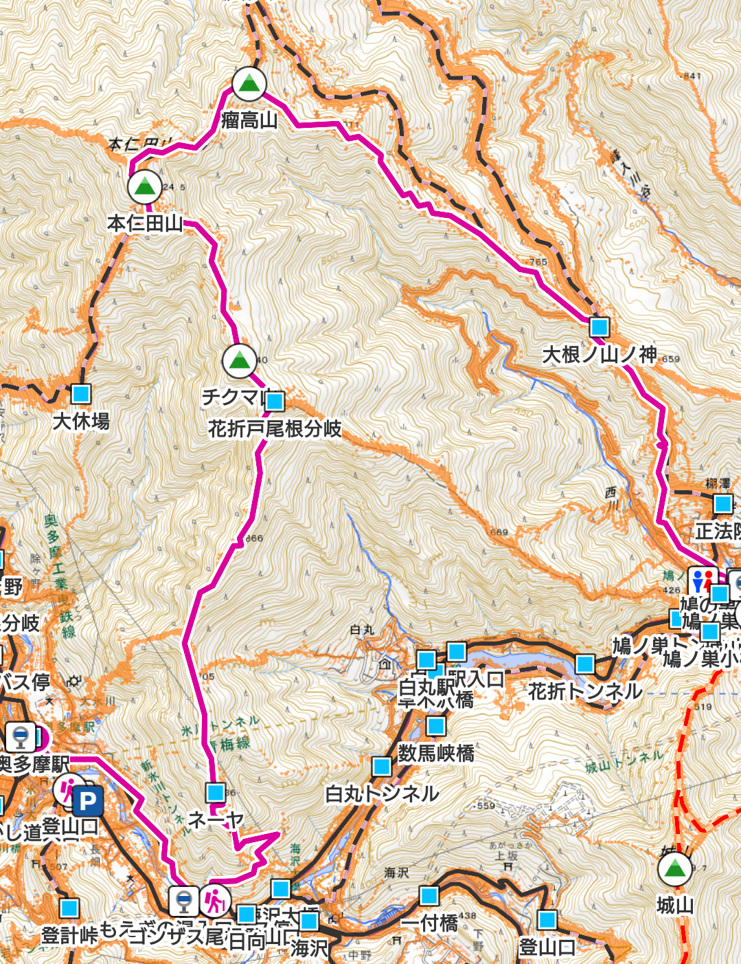 コース :奥多摩駅8:35ーゴンザス尾根入口8:58ー花折戸尾根分岐11:15-11:22