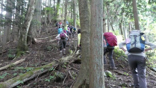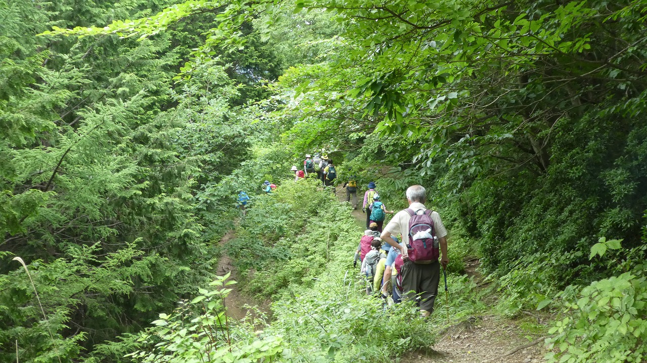 山川リーダー、スタッフの皆様、お疲れさまでした。ゴンザス尾根!!なんともユニークな名前!どんな登りになるか、ワクワク楽しみに参加しました。取付き点から急登をグイグイ上がっていくと、空のかなたでゴロゴロと何やら怪しい響きが聞こえてきました。最初のお水タイムでリーダーから「遠雷が聞こえますが、稲光は見えません。雨雲レーダーで確認すると、奥武蔵から栃木に向かって降水帯が移動しているので、このまま登ります」なんと頼もしい言葉と正確な観天望気。大休場尾根にはない岩ゴロの急登り、深い樹林帯、オドロオドロしい尾根歩き!予想通り千変万化の楽しいルートをワイワイ楽しく歩けました。ありがとうございました。