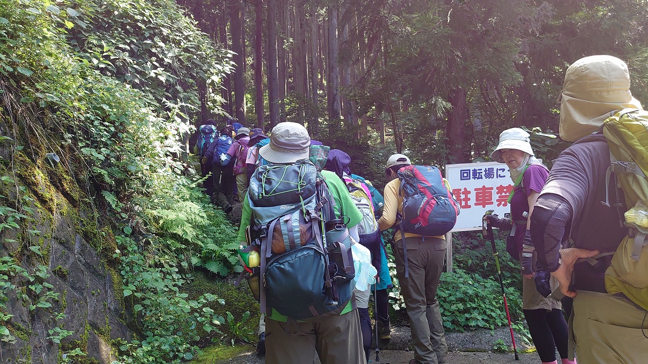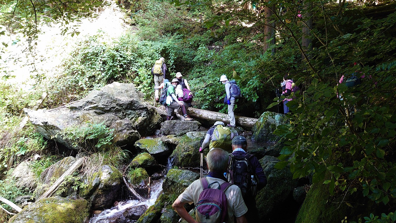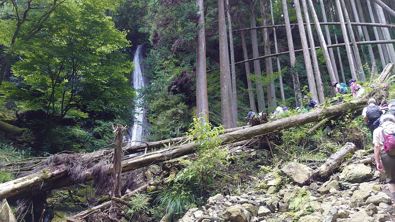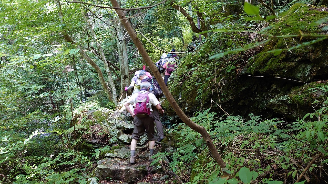 林道に入ってゲートを過ぎ、山道に入ると急傾斜と蒸し暑さと大小の岩の道に体調不良者が出た。一人は滝に出会う前に寝不足もあって早々に下山(参加リーダー二人が付き添う)。一人は「足のツリ」も最後まで歩いた。又、つづら岩下で昼食を終えて立ち上がった際に足のツリを感じるなど蒸し暑さと急登が体調不良等の条件・・・?が重なり夫々辛い思いをされた。バス時間の関係で「鶴脚山」はカット。参加Lや協力者、山行をリードしたSLやこれらを理解して頂いた参加者の皆様に感謝いたします。幸いに、本班はバス時間に間に合い、別班はタクシーでそれぞれ武蔵五日市駅に到着した。改めて、幸いにも怪我もなく終えられたのは、参加頂いた皆様やフォローして頂いた方々のお陰と感謝です。ありがとうございました。佐々木 保