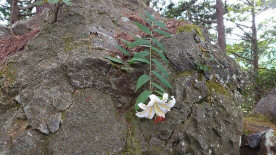 「ヤマユリ」が迎えてくれた。「千足バス停」「とうげん橋バス停」の分岐を経て「とうげん橋」バス停へ下山。