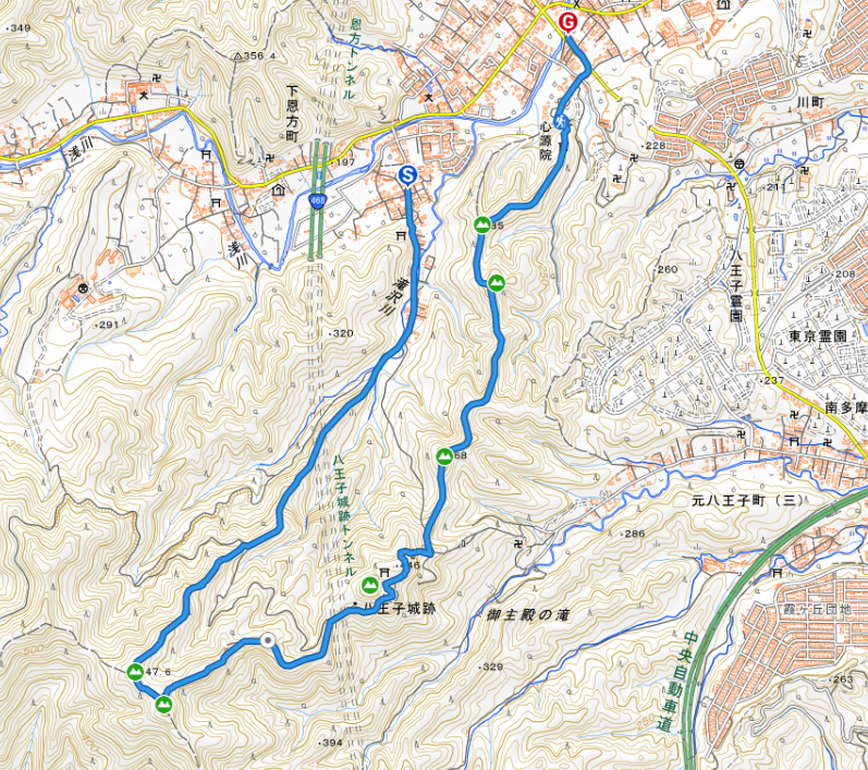 ▼コース :バス停09:05→滝沢川分岐9:30→滝の沢林道交差10:20→杉沢の頭11:00→富士見台(昼食11:20~11:55)→八王子城跡展望台12:40→柵門台13:05→向山北砦14:05→秋葉神社14:30(解散)→川原宿大橋バス停=高尾駅