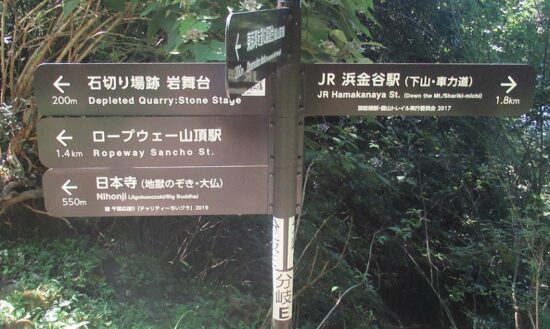 コース:浜金谷駅 10:15集合 歩行開始 10:30 → 車力道 → 東京湾を望む展望台 昼食 11:45-12:20 → 鋸山 12:40 → 石切場跡 13:30 → 日本寺 拝観 14:20-15:20 → 関東ふれあいの道 →