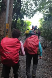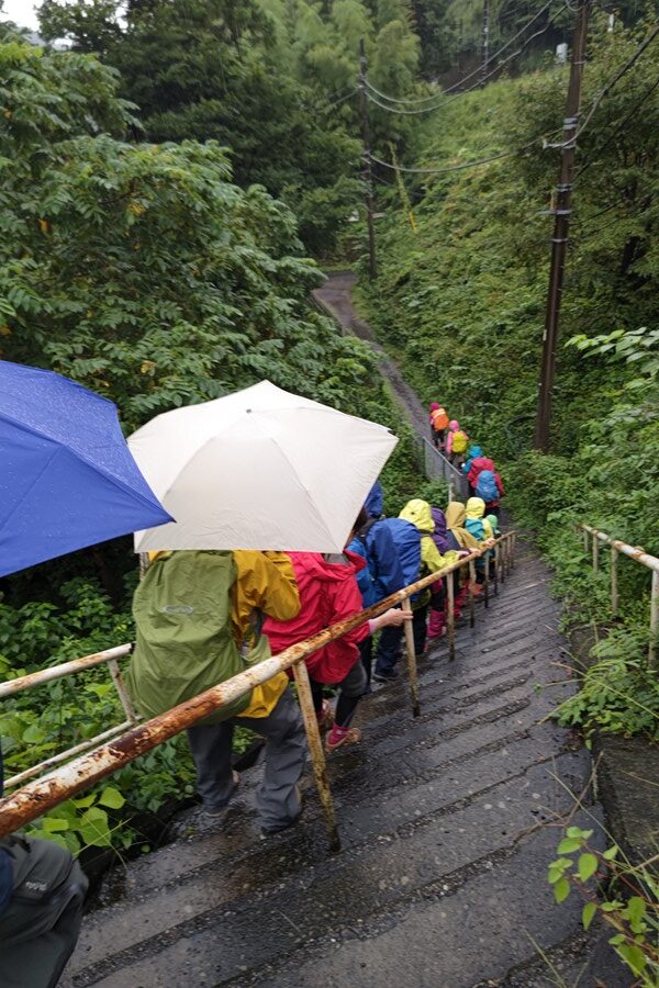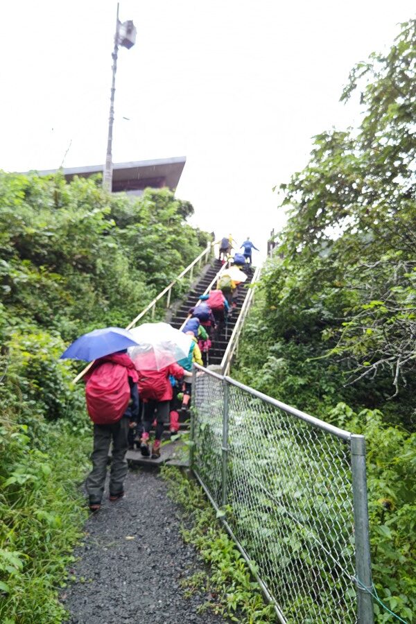 歩きにくい階段、注意して下ります。雨具が色とりどりで綺麗です。