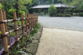 竹垣 しつらえる場所によって、竹の組み方や、棕櫚の結び方、玉縁など意匠の凝らし方など様々で、日本庭園ならではの景物の一つです。