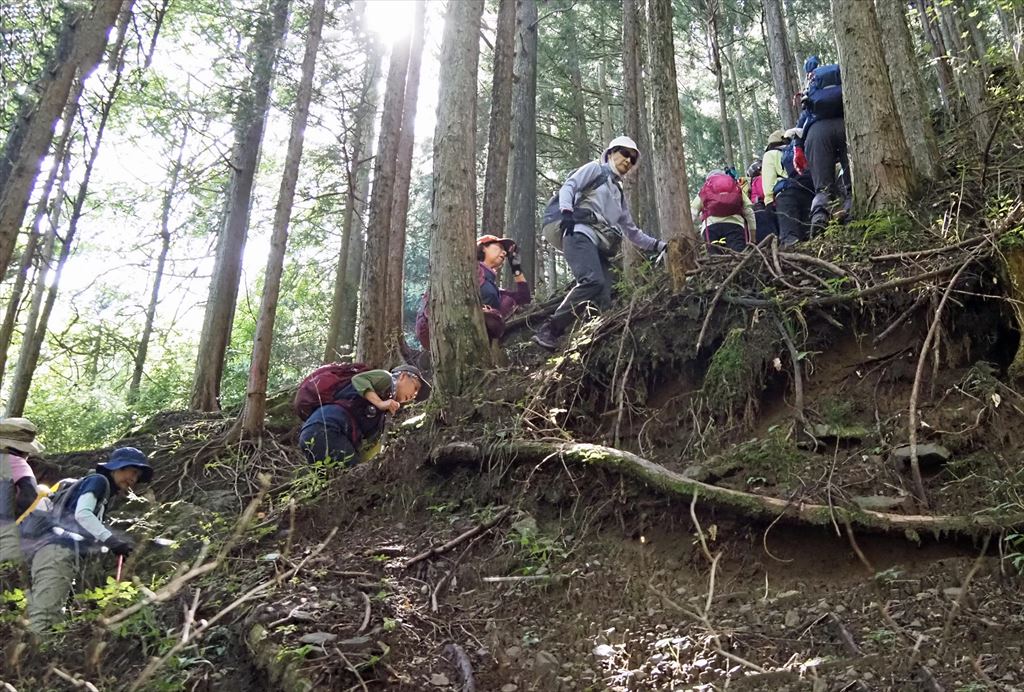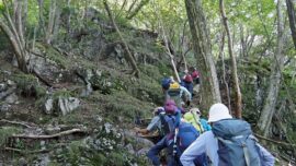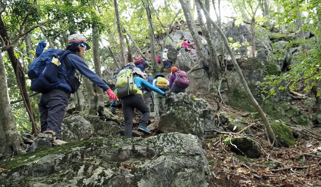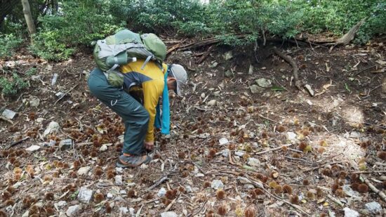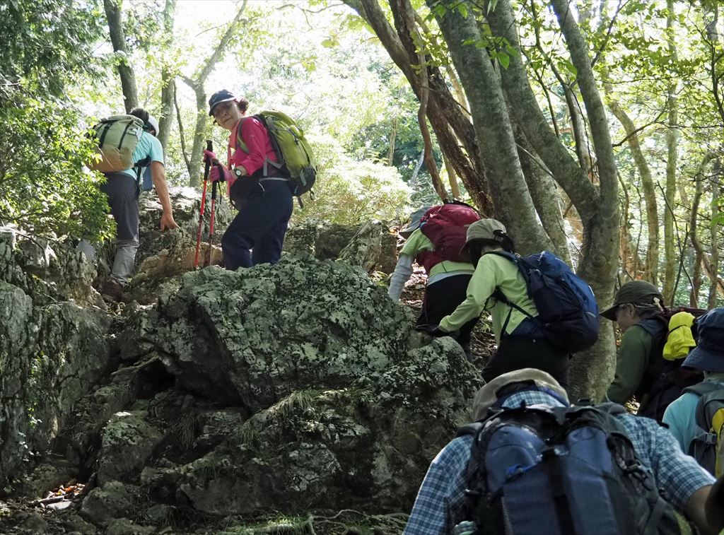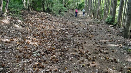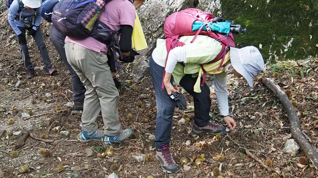 歩くごとに、足元に赤茶色の山栗があり、こんな山栗が多い山は初めてです。休憩の度に、四つん這いになり熱心に栗拾い。また、岩登りも何箇所あり、変化の多いコースでした。 大倉昌子