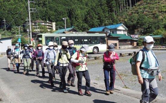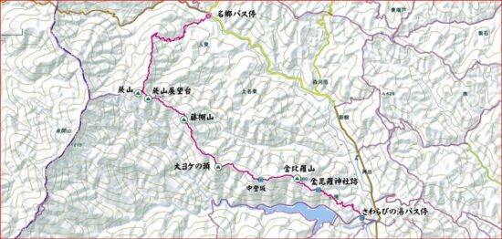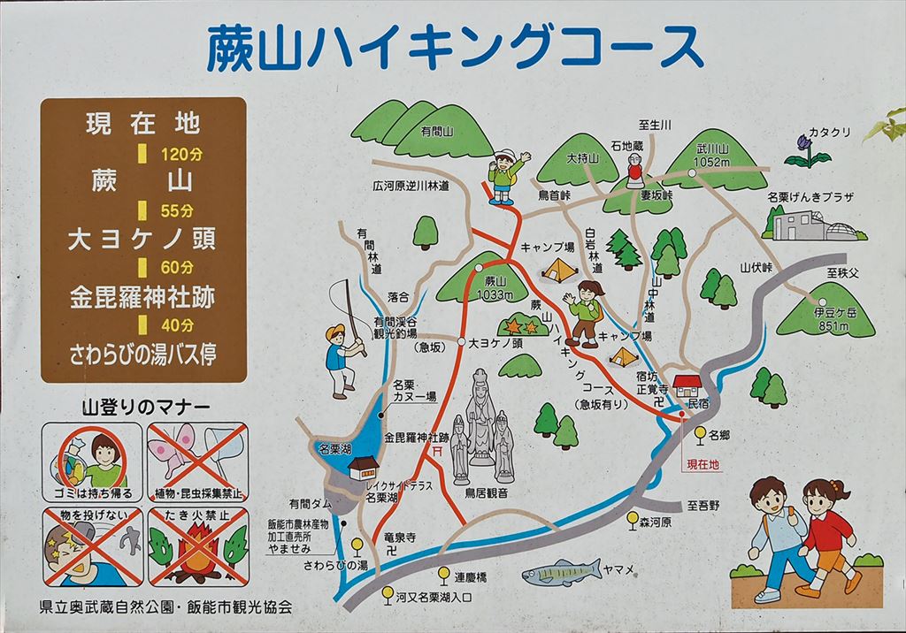 飯能駅=名郷バス停9:45→12:55蕨山(昼食・集合写真)13:30→蕨山展望台13:40→藤棚山14:20→大ヨケの頭15:00→金毘羅神社跡16:10→さわらびの湯バス停16:50=飯能駅