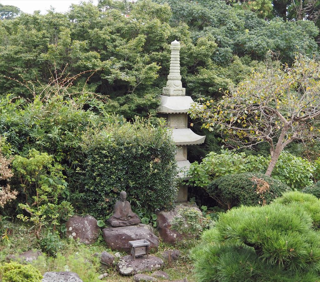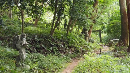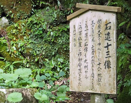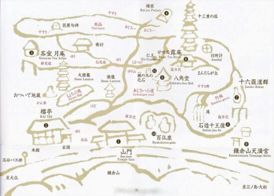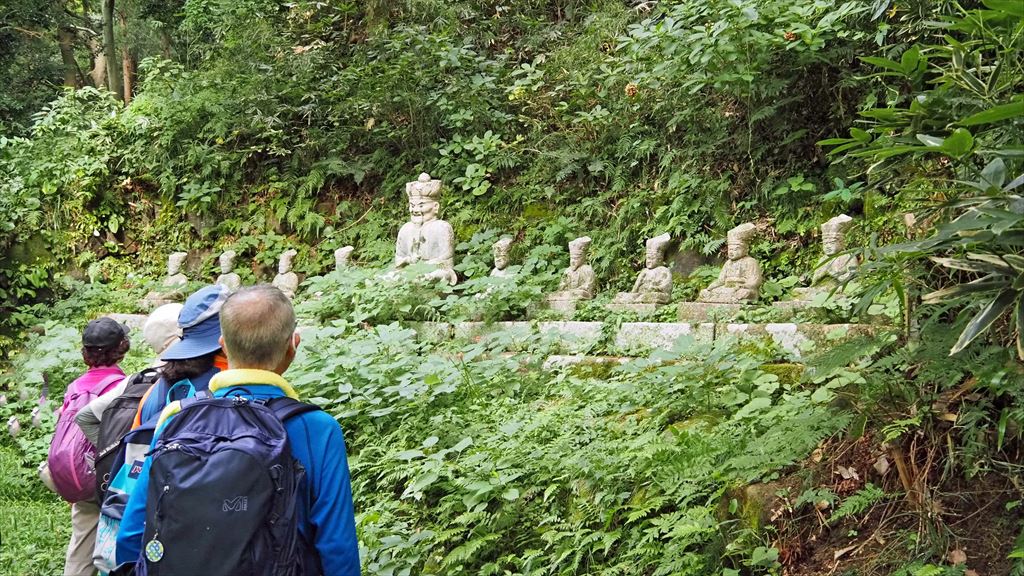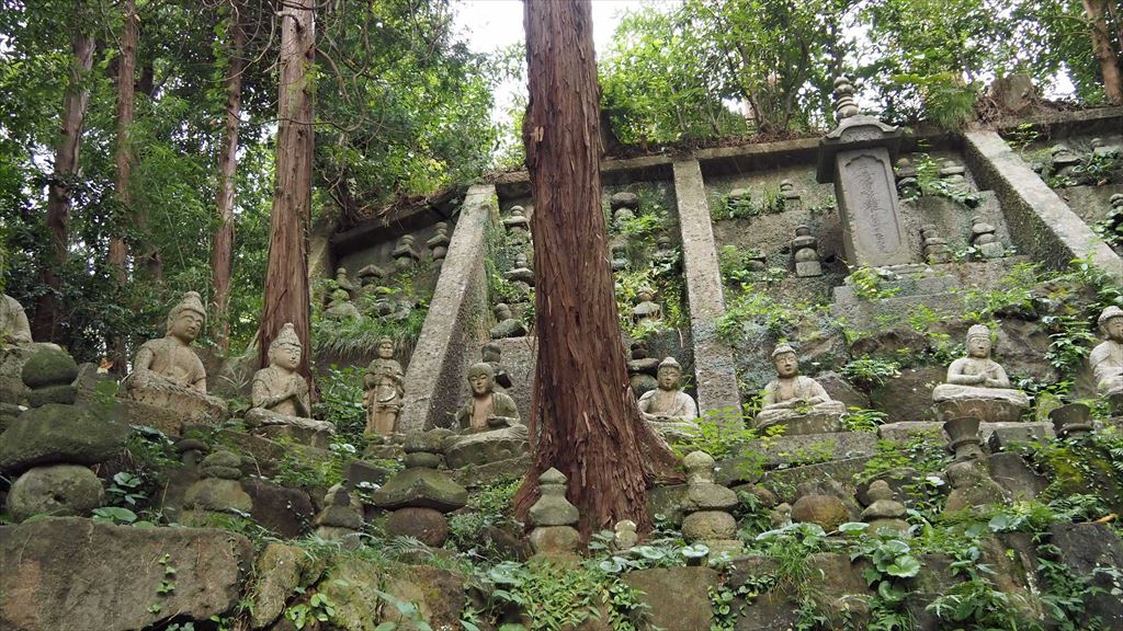 5万平方メートルの広さの廻遊式庭。高低差は20m。羅漢像、石仏群等が心を癒してくれる。