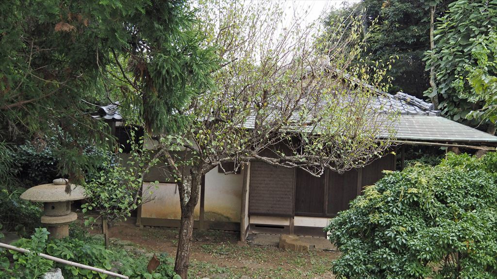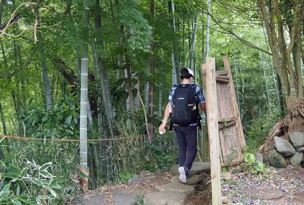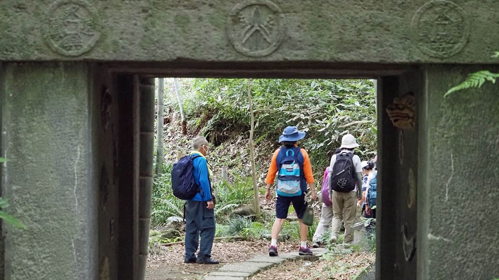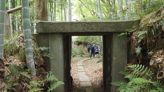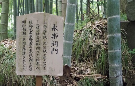 しばらくすると竹林の中に家紋が彫られた石門がありました。永楽通宝紋、沢瀉紋(おもだかもん)が彫られていた。この紋は、鎌倉西御門の高松寺の旦那大名水野家山門と同様 昭和初期この地に移建されたもの。