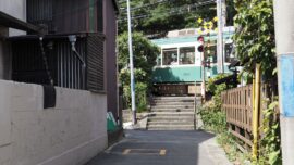 江ノ電通過した。線路の向こう側は、御霊神社だ。(鎌倉七福神巡りの一つ)
