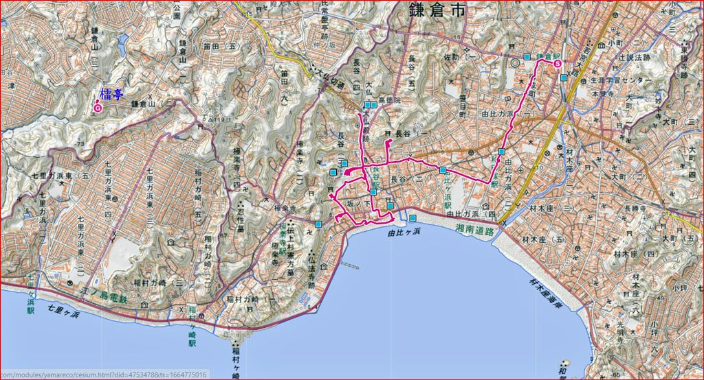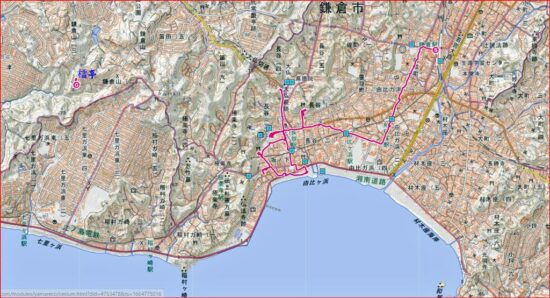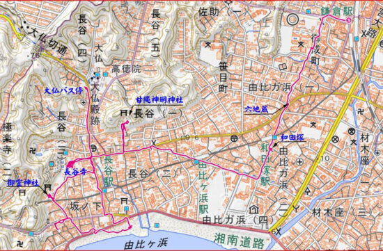 鎌倉駅10:10→六地蔵10:30→和田塚10:47→11:05甘縄神明神社11:20→由比ヶ浜→12:00御霊神社12:08→12:17長谷観音13:10→大仏前=高砂バス停13:44→13:46檑亭14:55=鎌倉駅