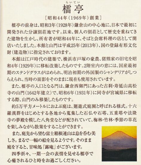 「檑」とは「すりこぎ」のことです。古来、すりこぎは山椒の幹で作ったものを最上とし、この地に山椒の木が多くあったことから、檑亭の名がつけられました。