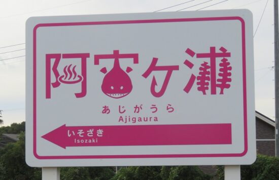 阿字ヶ浦駅にはあんこうや温泉マークがはいっています