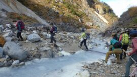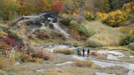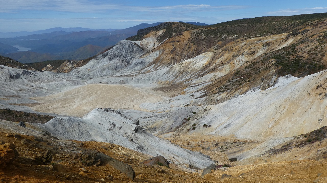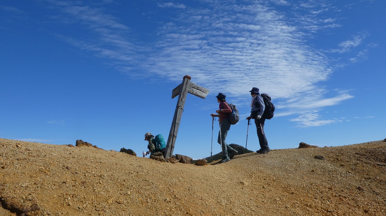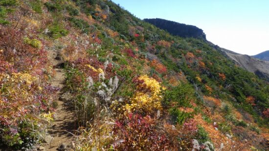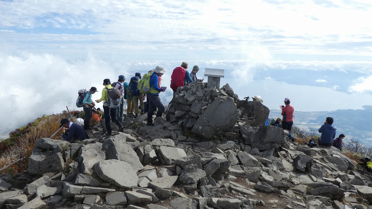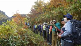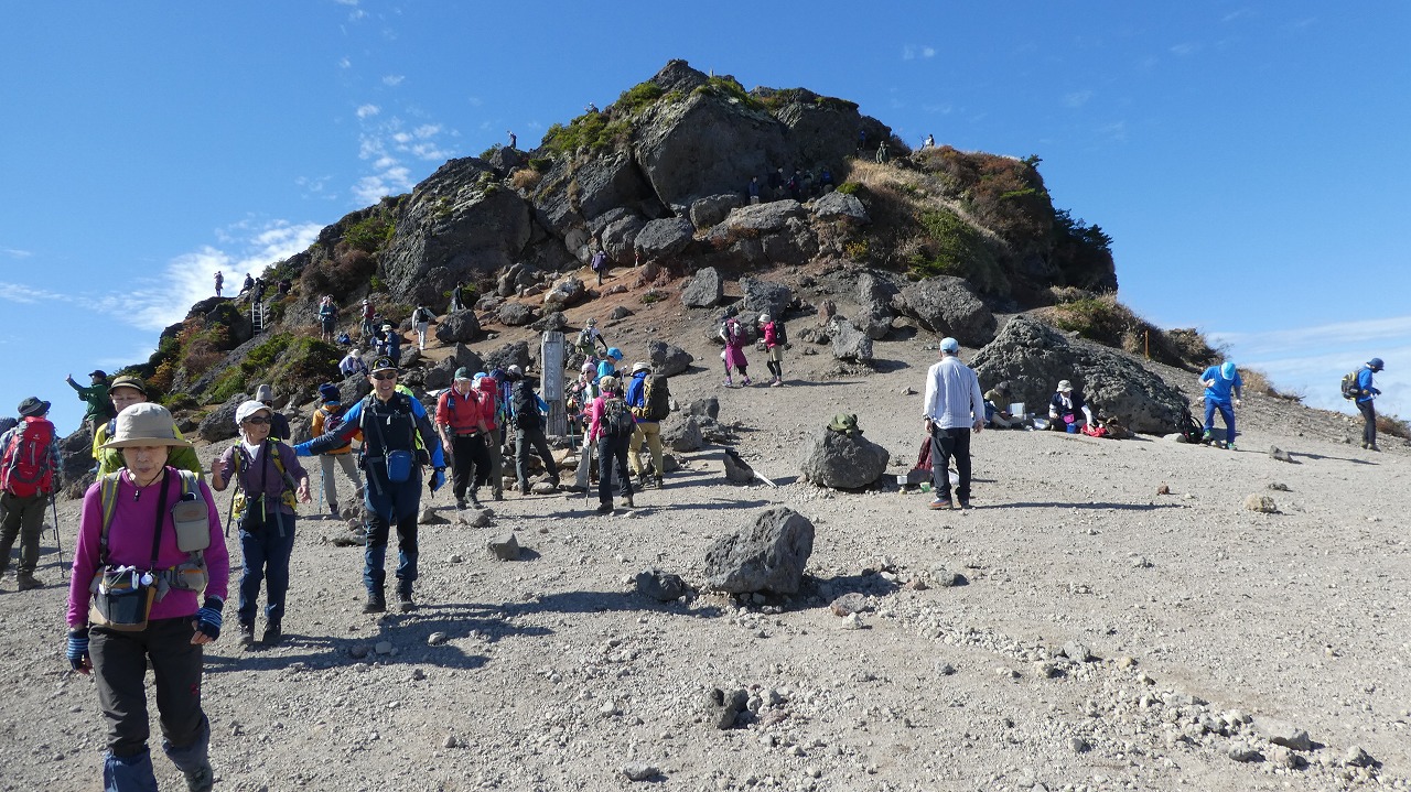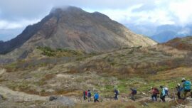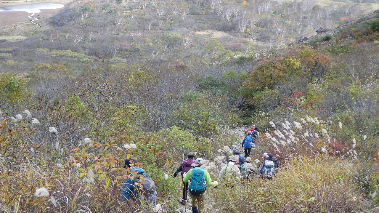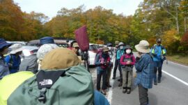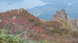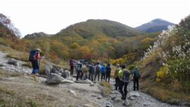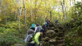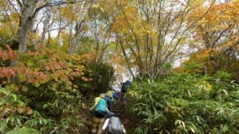「1日目の磐梯山と、2日目の安達太良山、共に紅葉の適期にあたったのと、晴天も重なり、どこもかしこも輝いて見えた2日間だった。安達太良山は宿のご主人のおすすめで、温泉源泉地を経由しての登り、素晴らしいパノラマが広がり、参加者の歓声も半端ない。展望コースとして沢山の報告がアップされていたが期待を裏切らぬ展望に係としてホットする。青い空の下、智恵子が想い続けた故郷の山登りをいっぱいの人がゆっくりと楽しんでいた。地元と感じる言葉の響きに、ずうっと愛されている山なんだと、改めて思った。」