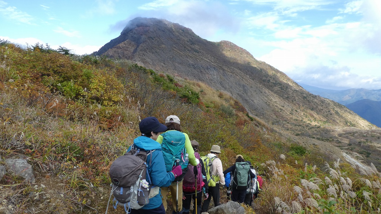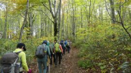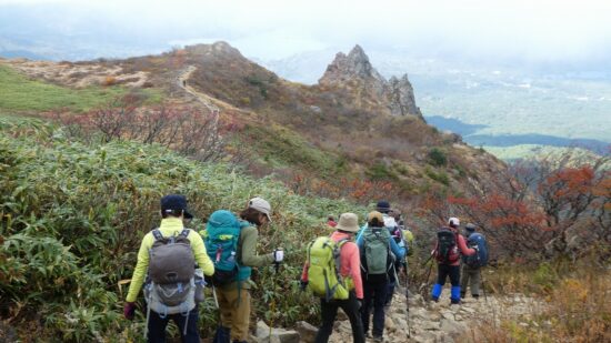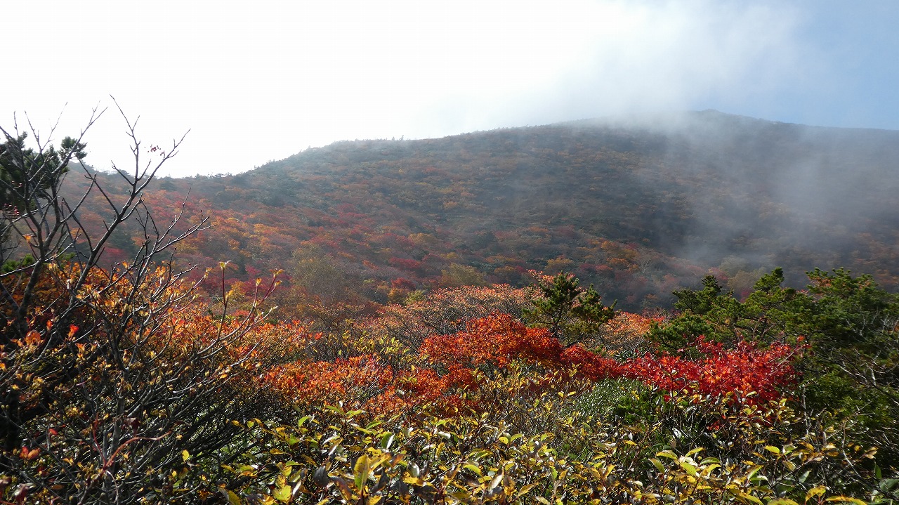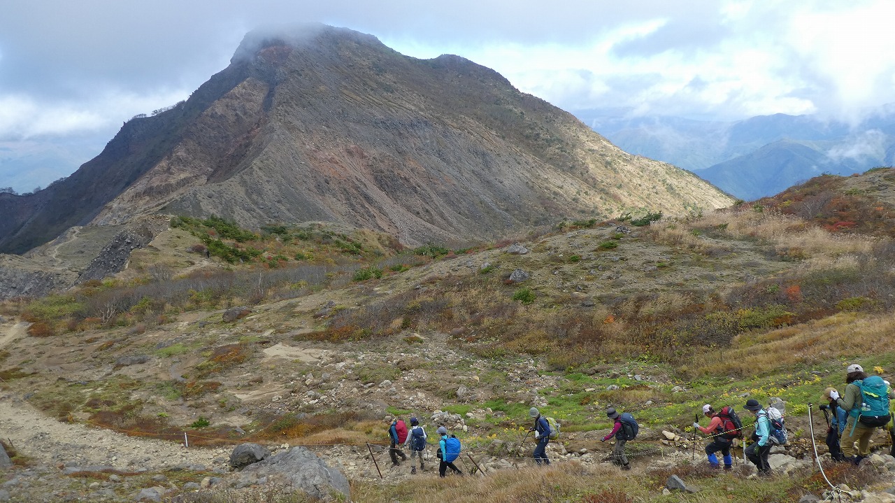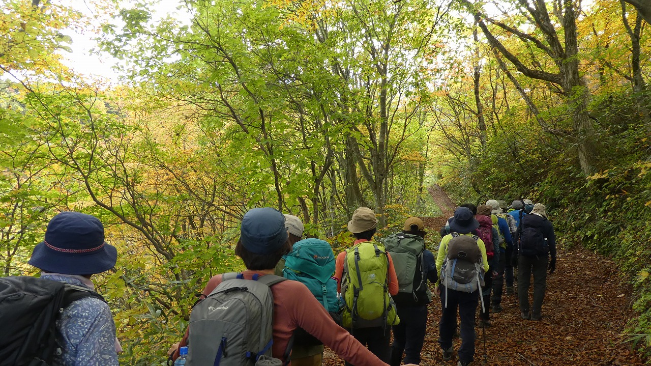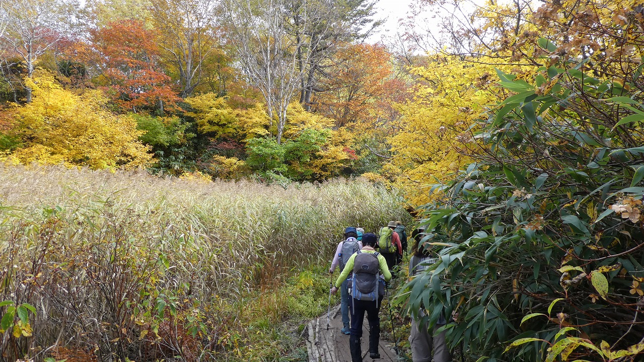 山川リーダー、参加会員の皆様お疲れさまでした。会津のシンボル「宝の山よ」と民謡に歌い継がれる磐梯山と、高村光太郎の「智恵子抄」でもその名が広く知られた安達太良山。二日間で、錦秋の絨毯が敷き詰められた二山を楽しく歩けました。ツアー代金では、「福島来て割」の申請をしていただき、おまけに¥1000クーポン券まで!安達太良山の下山では、急遽クーポン券でスキー場のゴンドラに乗り、空から紅葉が楽しめました。秘密の湯守り管理路を歩け、宿の無料送迎など、微に入り細に入り細かな手配をありがとうございました。 とても思いで深い山行でした。