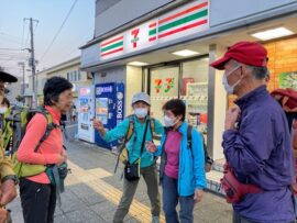蓑毛バス停にて、準備体操の後、リーダー挨拶。