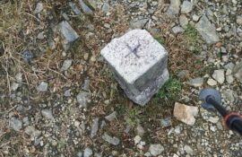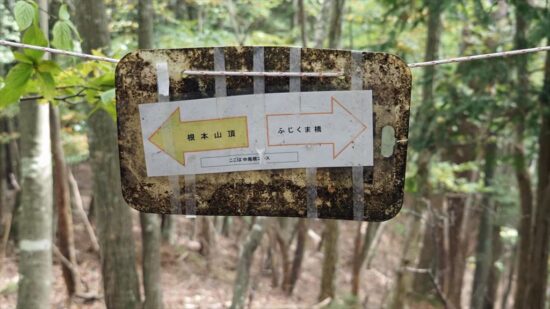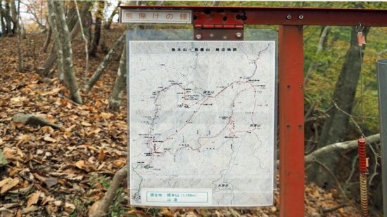 熊除けの鈴。鉄パイプを鉄棒で殴って鳴らす。いたるところにありました。木肌も剝がされていたところもあった。熊がよく出没する?周辺地図は尾根道ぞいや各山頂に数多くあった。標識や山頂名等に「根本山瑞雲俱楽部」名が記載されていた。よく管理している。地元誇りの山か。感謝!