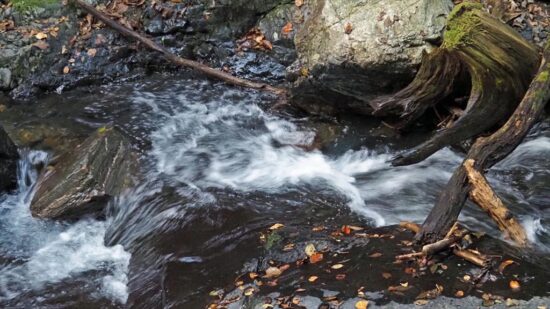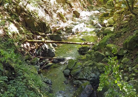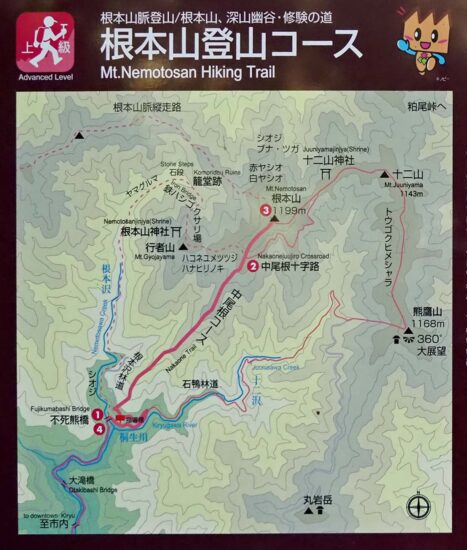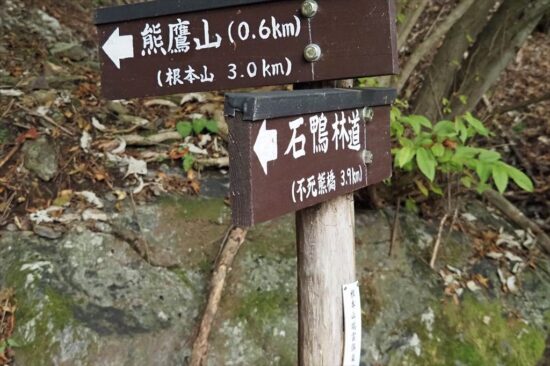 案内板からすこし過ぎると不死熊橋。根本沢ルート(左側の赤い矢印標示)と石鴨林道分岐。