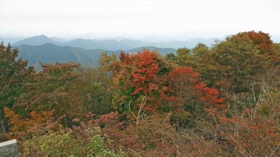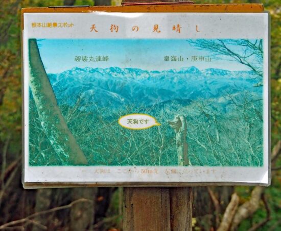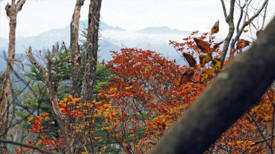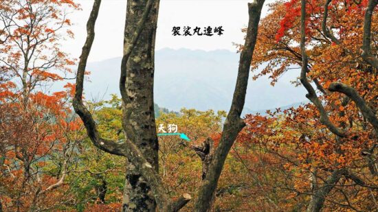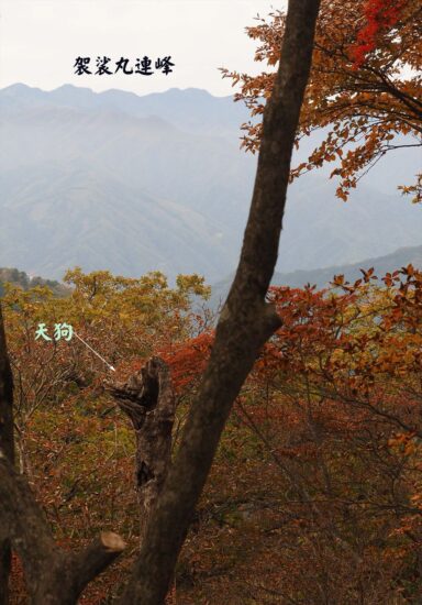 天狗〈木の幹の先端が折れて天狗に似ている?)と背景の袈裟丸連峰と紅葉がマッチして綺麗でした。その右には皇海山などが見えました。