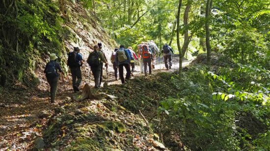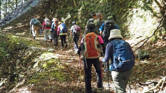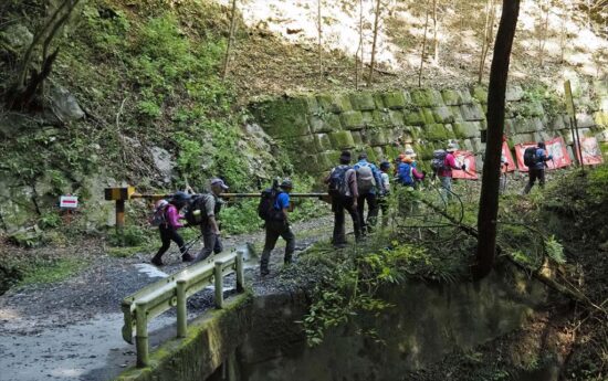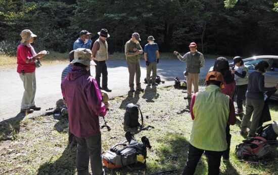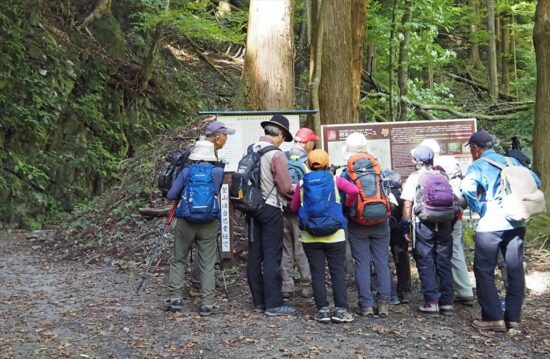 登山コース等案内板前で、リーダー説明。不死熊橋の手前に設置されていた。