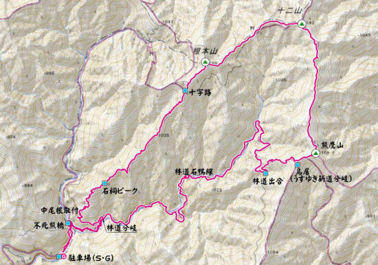 JR両毛線桐生駅=タクシー=駐車場→根本山登山口11:05→不死熊橋11:13→石鴨林道分岐11:25→中尾根取付11:35→石祠ピーク12:15→中尾根十字路13:20→13:30根本山(昼食)14:07→十二山14:45→15:18熊鷹山15:30→鳥居15:35→林道出合16:00→石鴨林道→不死熊橋16:58→駐車場17:05=タクシー=JR両毛線桐生駅
